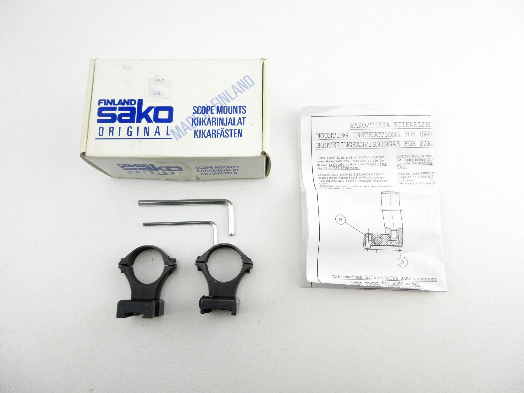 (1) SET OF ORIGINAL SAKO SCOPE RINGS AND BASES, 30MM LOW, WITH ORIGINAL PACKAGING & MOUNTING INSTRUCTIONS. SEE PHOTOS.