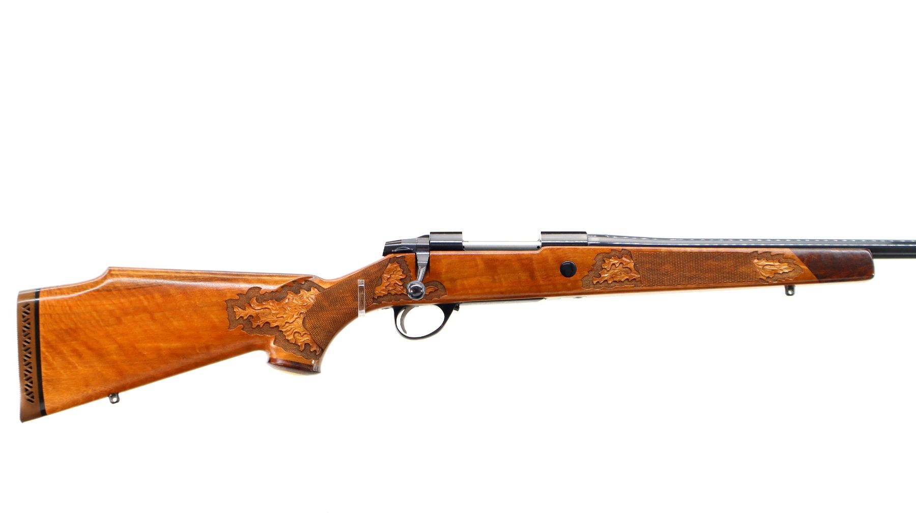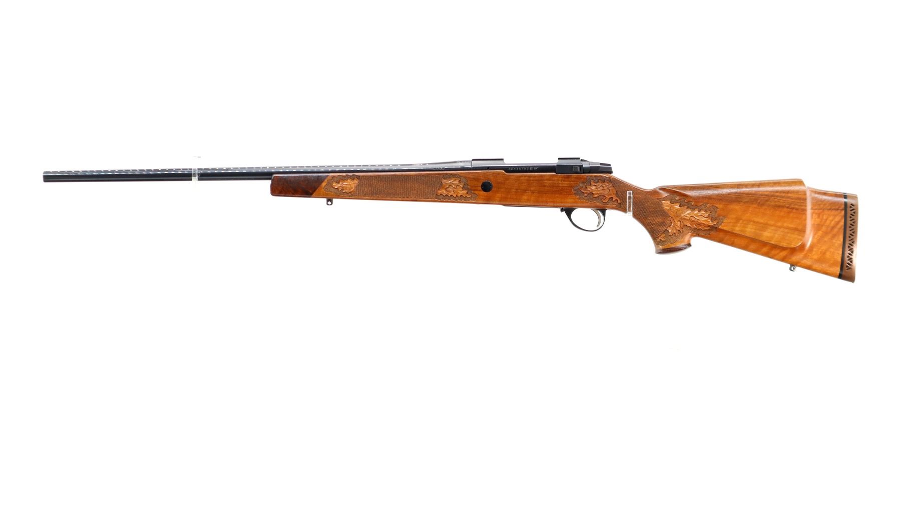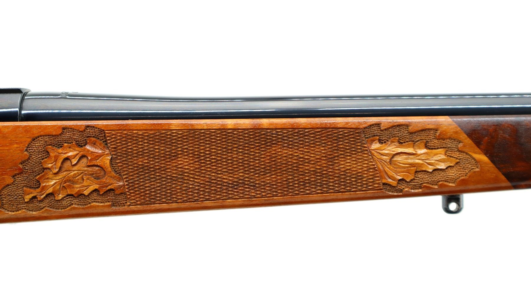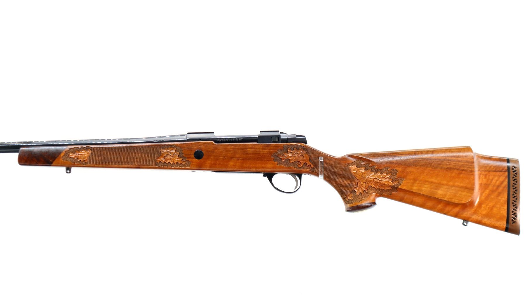 Main Description: No sights, Polish blued finish, tapered round barrel, receiver has integral scope bases, checkered bolt knob. One piece Satin finish wood stock, Rosewood forend and pistol grip caps with brass medallion, checkered forearm and pistol grip with carved Oak Leaves, cheek rest, brown vented rubber recoil pad, engraved hinged floor plate and trigger guard, swivel studs, bottom of barrel etched Imported by Stoeger.