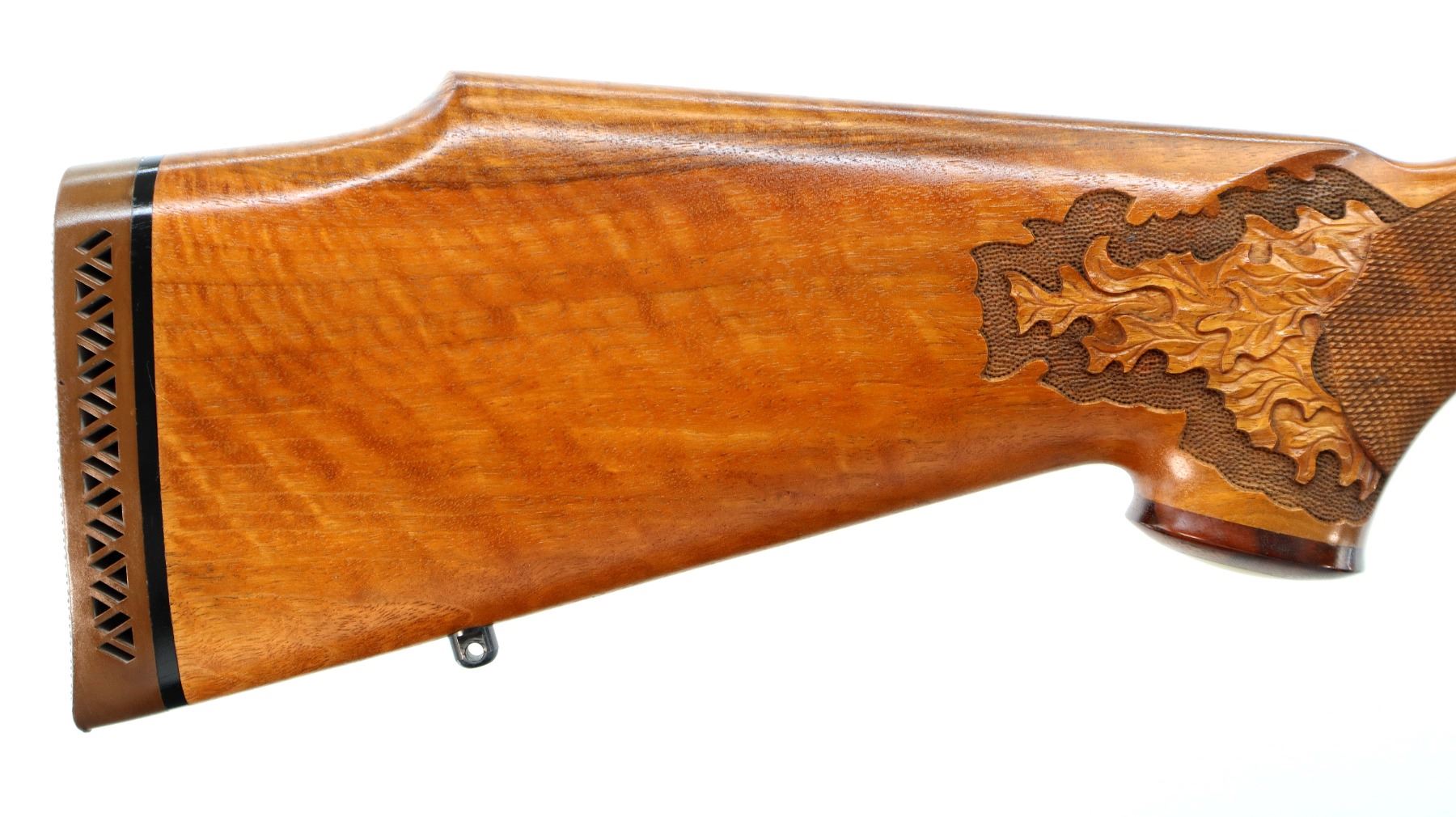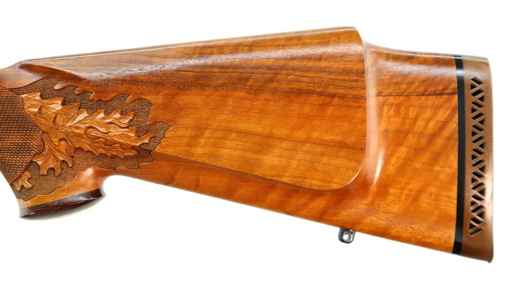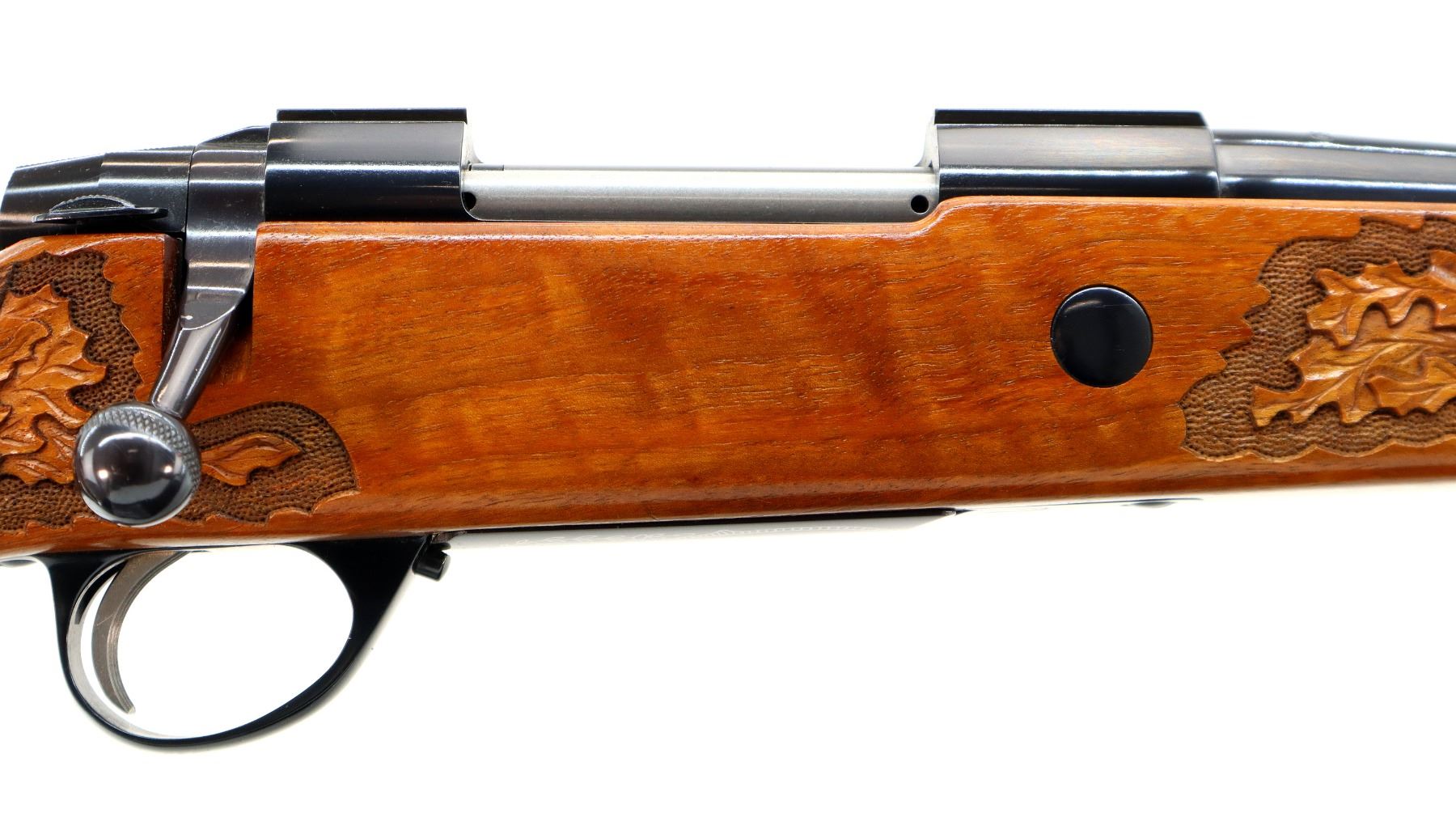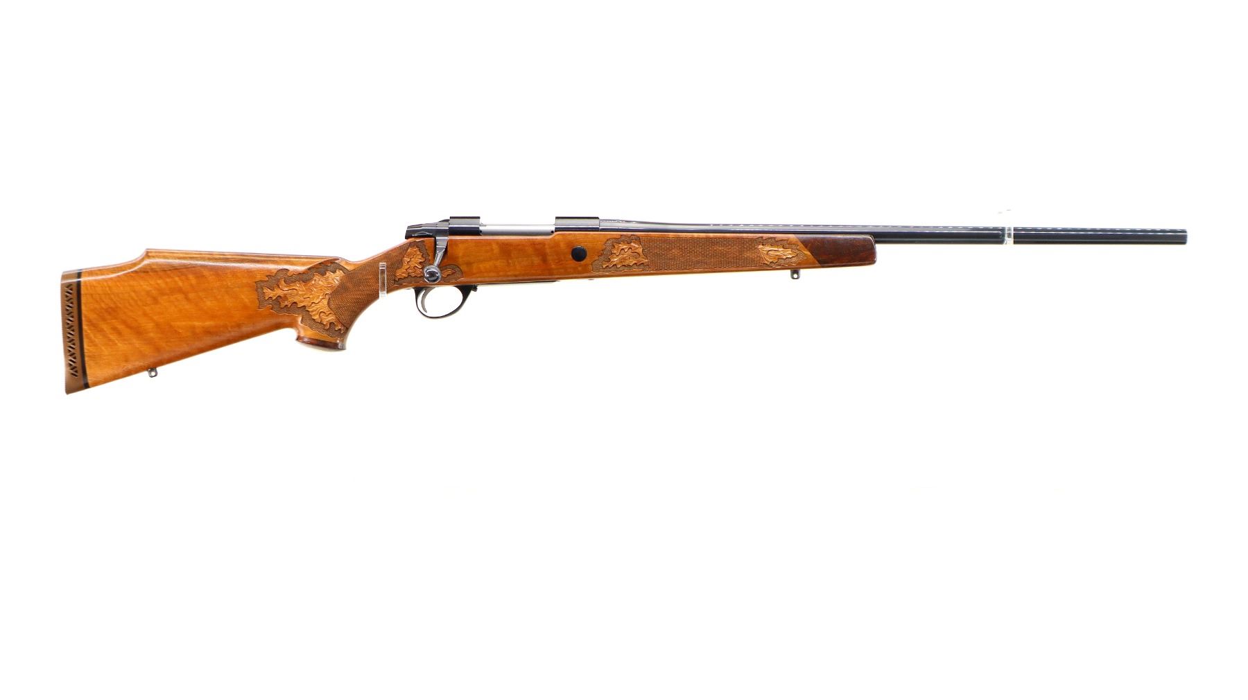 Main Description: No sights, Polish blued finish, tapered round barrel, receiver has integral scope bases, checkered bolt knob. One piece Satin finish wood stock, Rosewood forend and pistol grip caps with brass medallion, checkered forearm and pistol grip with carved Oak Leaves, cheek rest, brown vented rubber recoil pad, engraved hinged floor plate and trigger guard, swivel studs, bottom of barrel etched Imported by Stoeger.