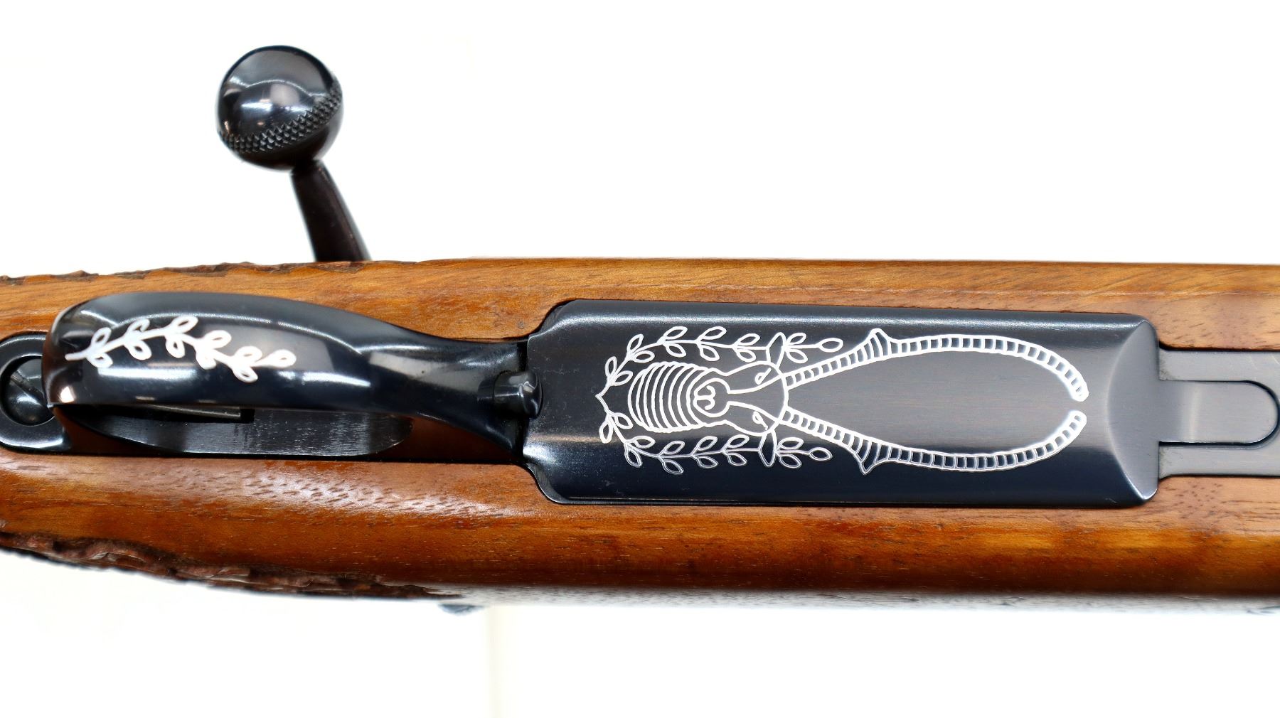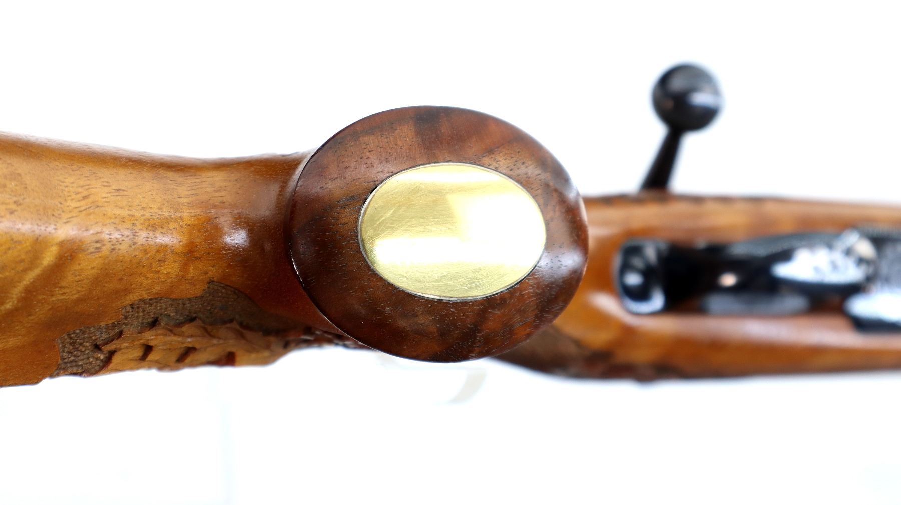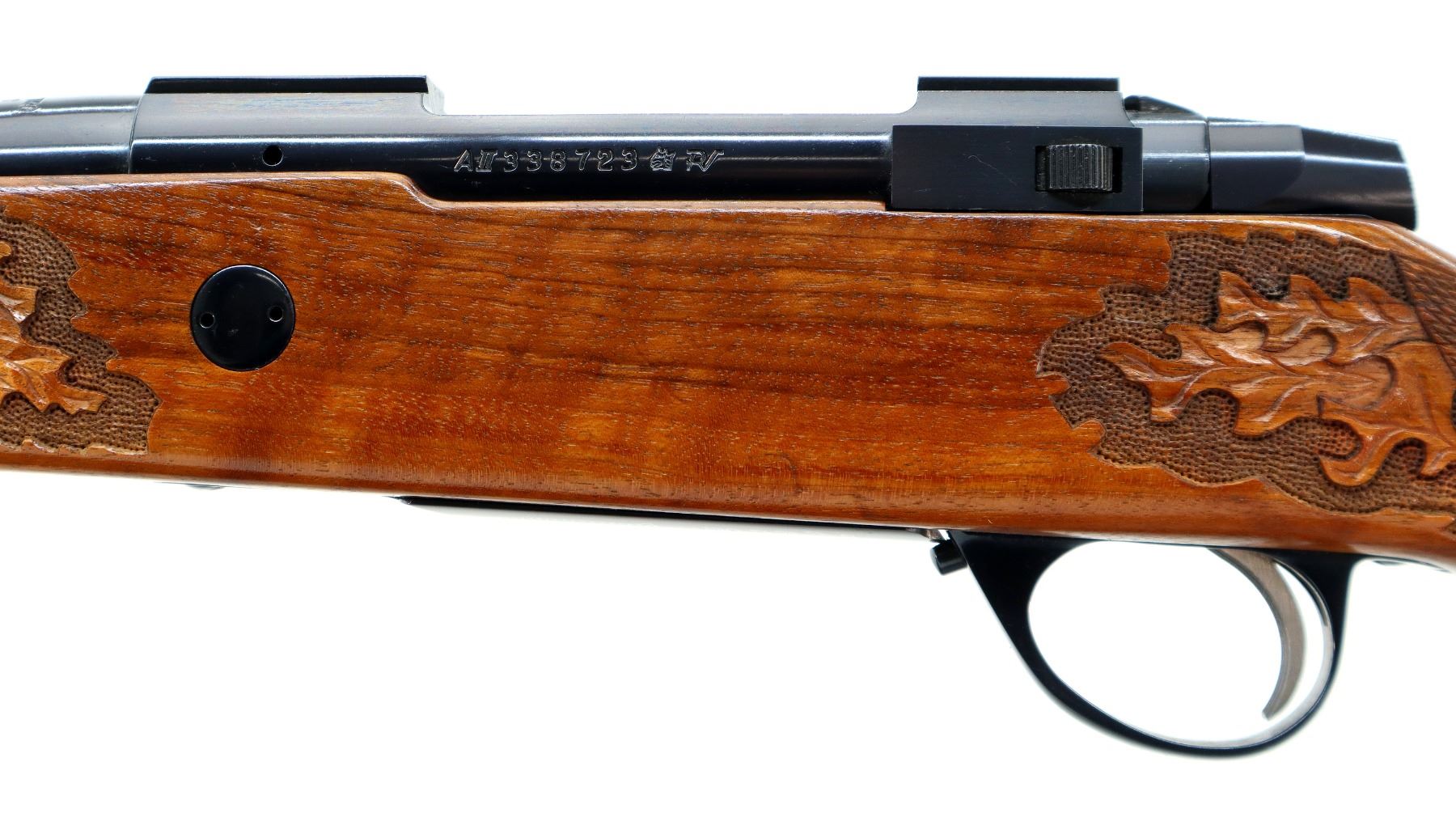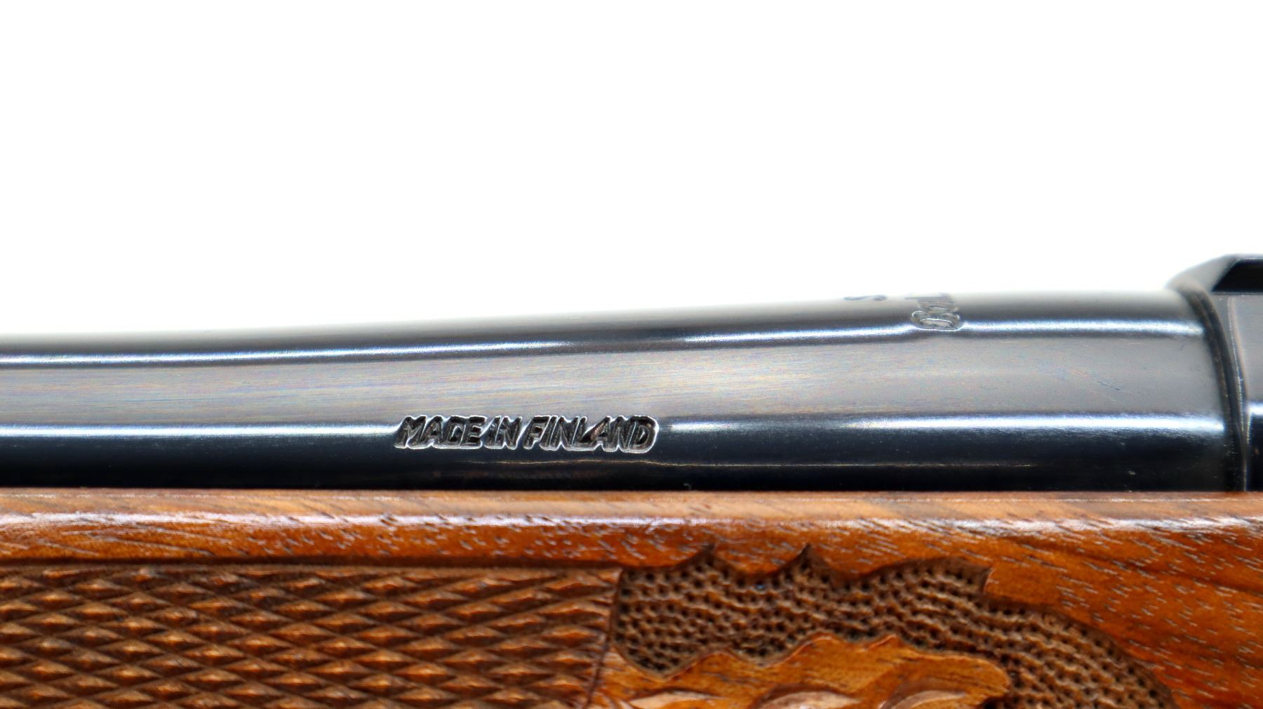 Main Description: No sights, Polish blued finish, tapered round barrel, receiver has integral scope bases, checkered bolt knob. One piece Satin finish wood stock, Rosewood forend and pistol grip caps with brass medallion, checkered forearm and pistol grip with carved Oak Leaves, cheek rest, brown vented rubber recoil pad, engraved hinged floor plate and trigger guard, swivel studs, bottom of barrel etched Imported by Stoeger.