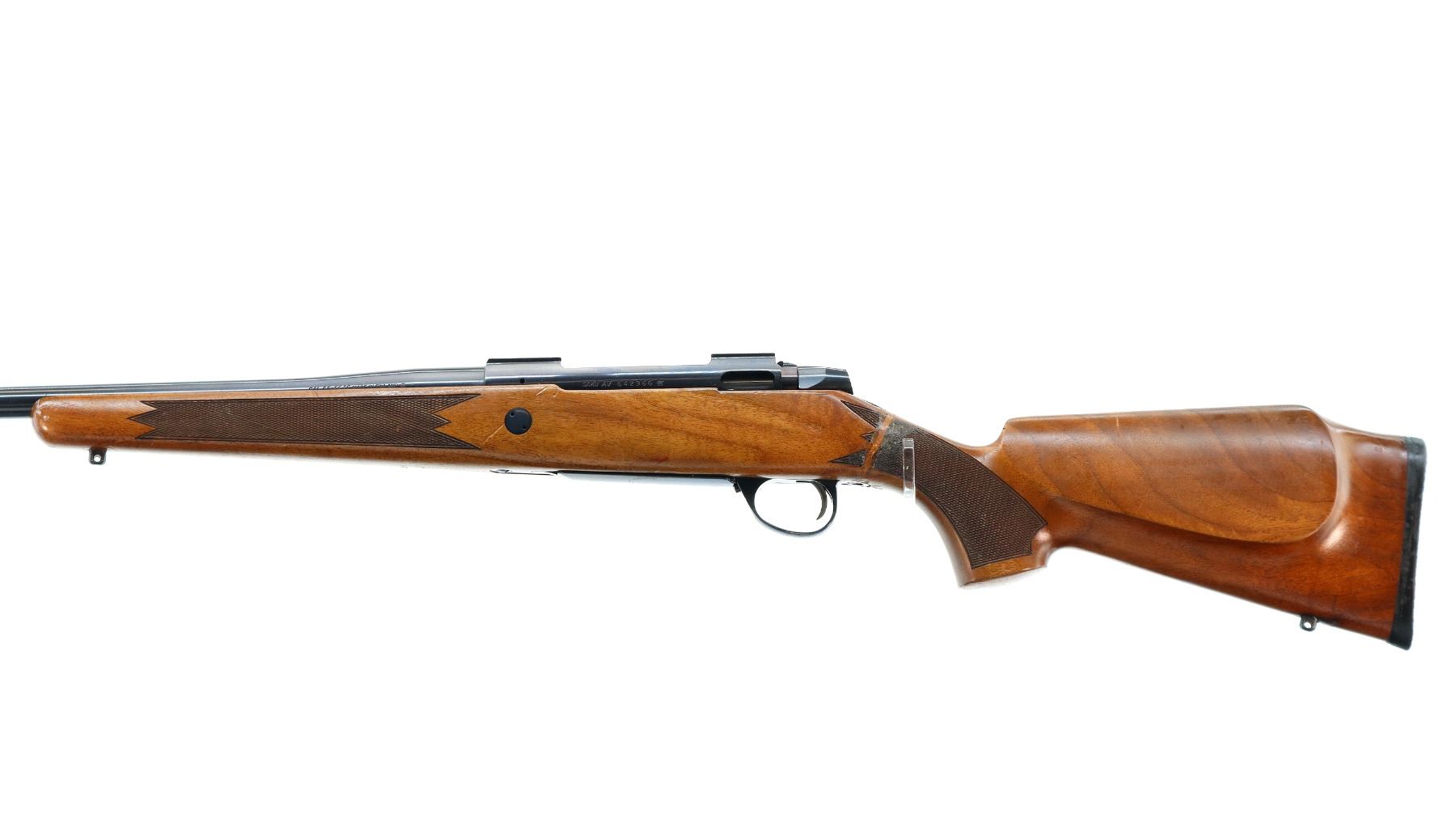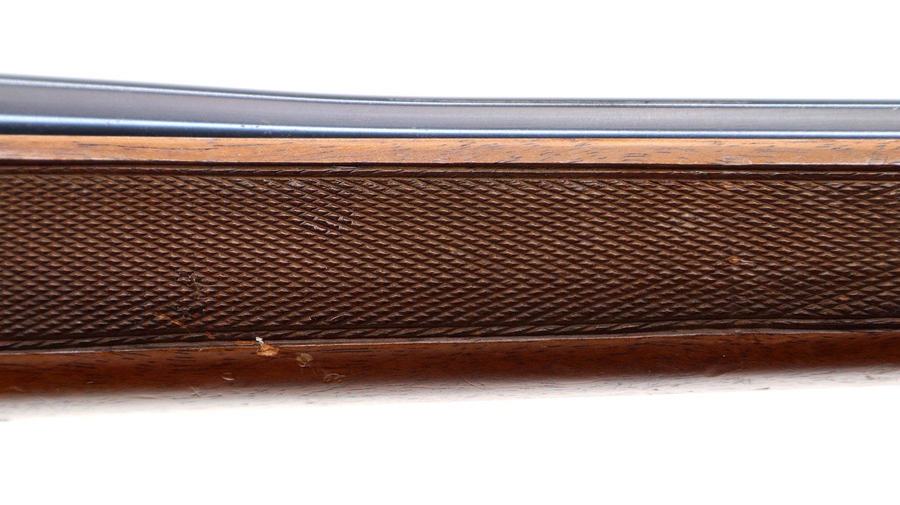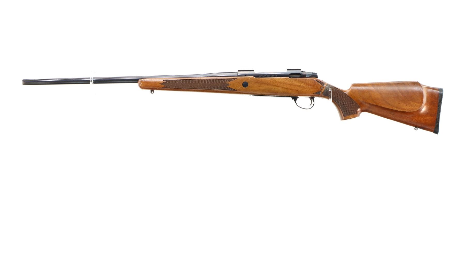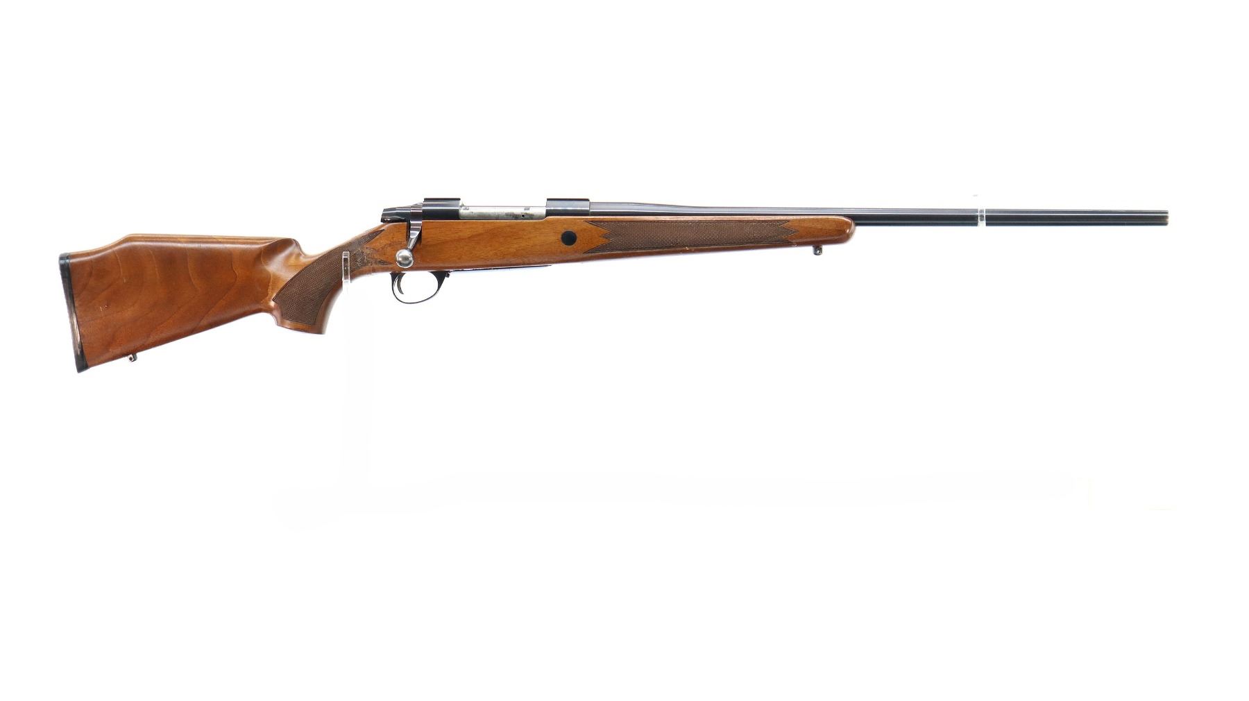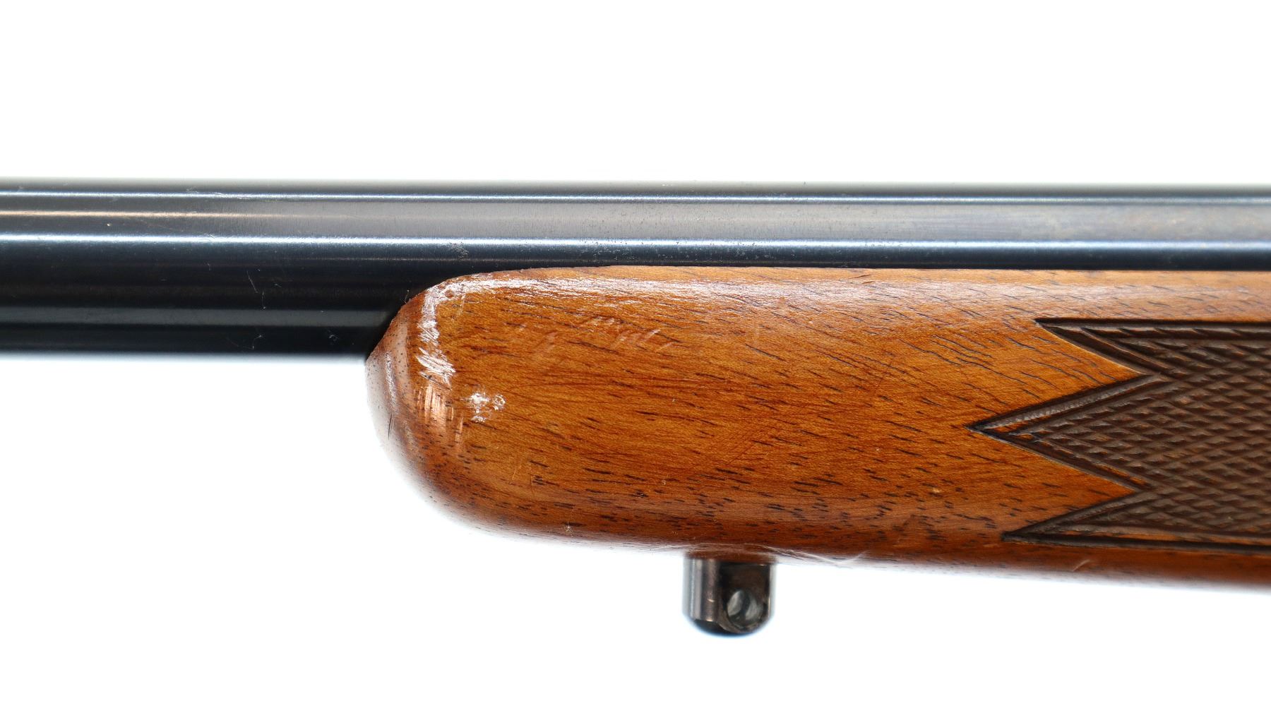 Main Description: Missing front and rear sights threaded holes present, blued finish, receiver has integral scope bases, smooth bolt knob. Missing bolt stop assembly. One piece wood stock, checkered forearm and pistol grip, stock has been broken through wrist and repaired, cheek rest, black rubber recoil pad, hinged floor plate, swivel studs.