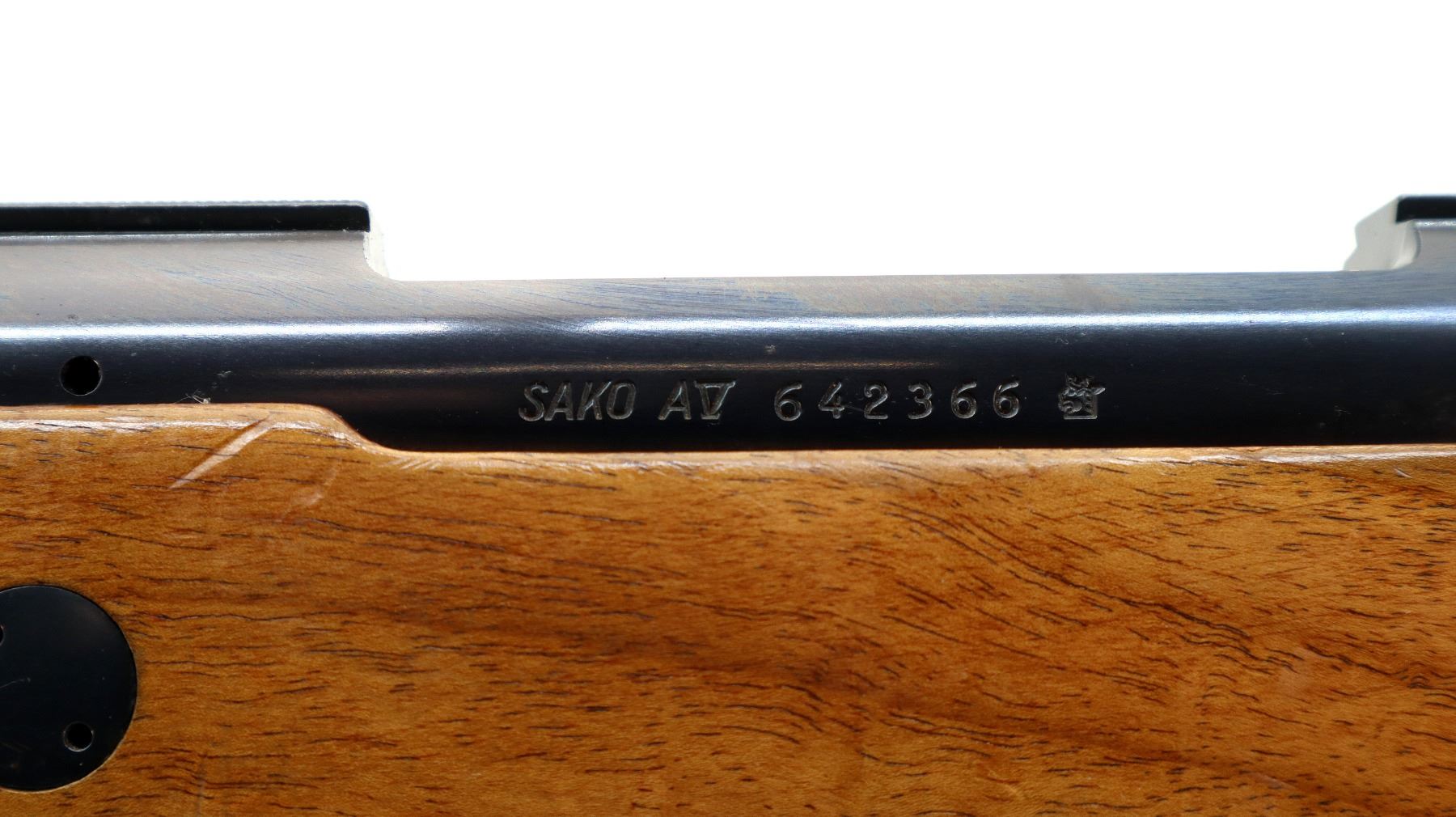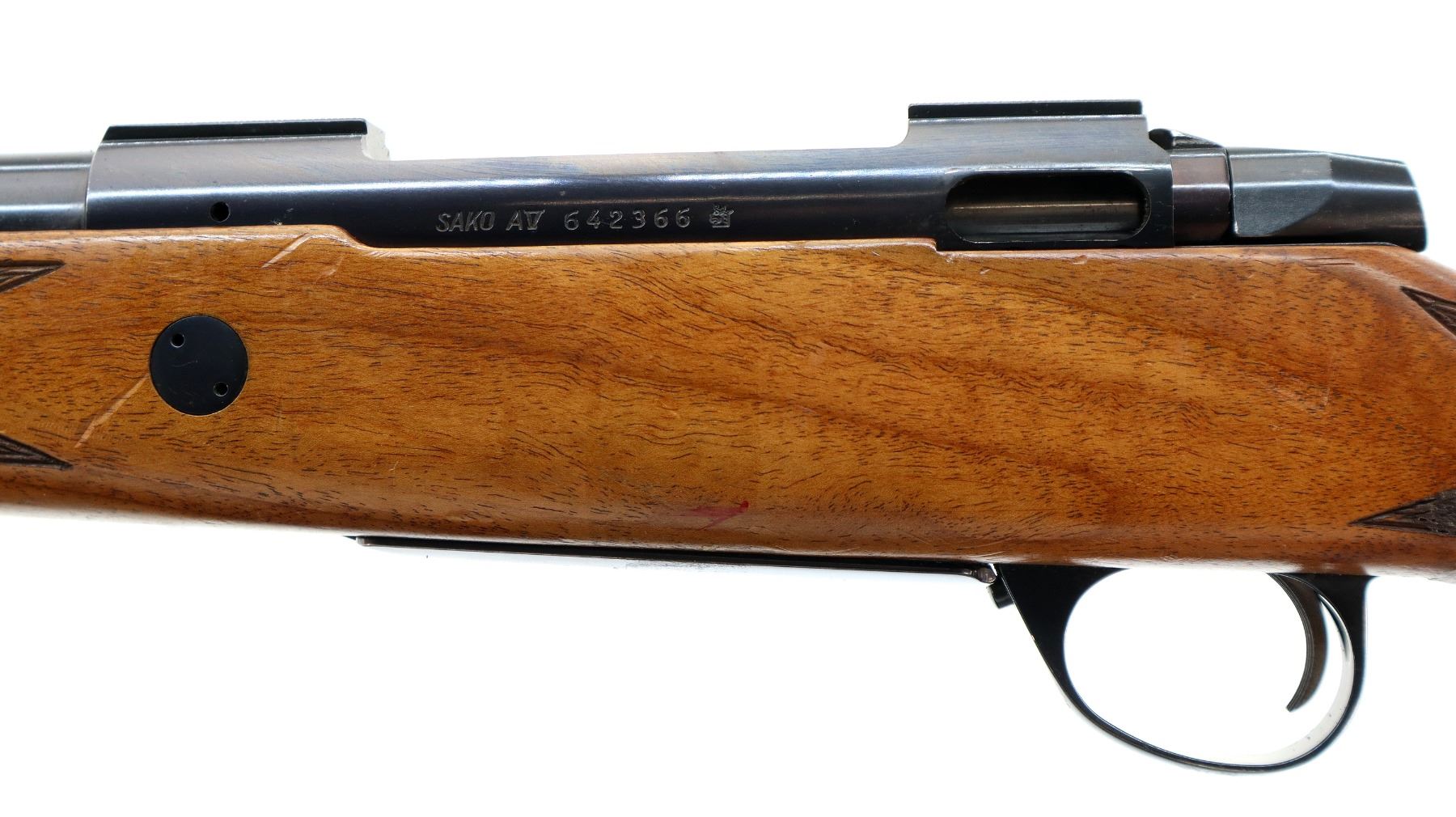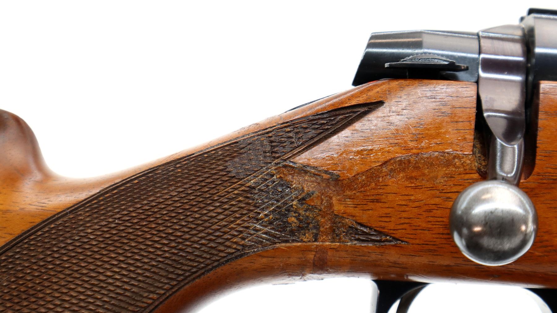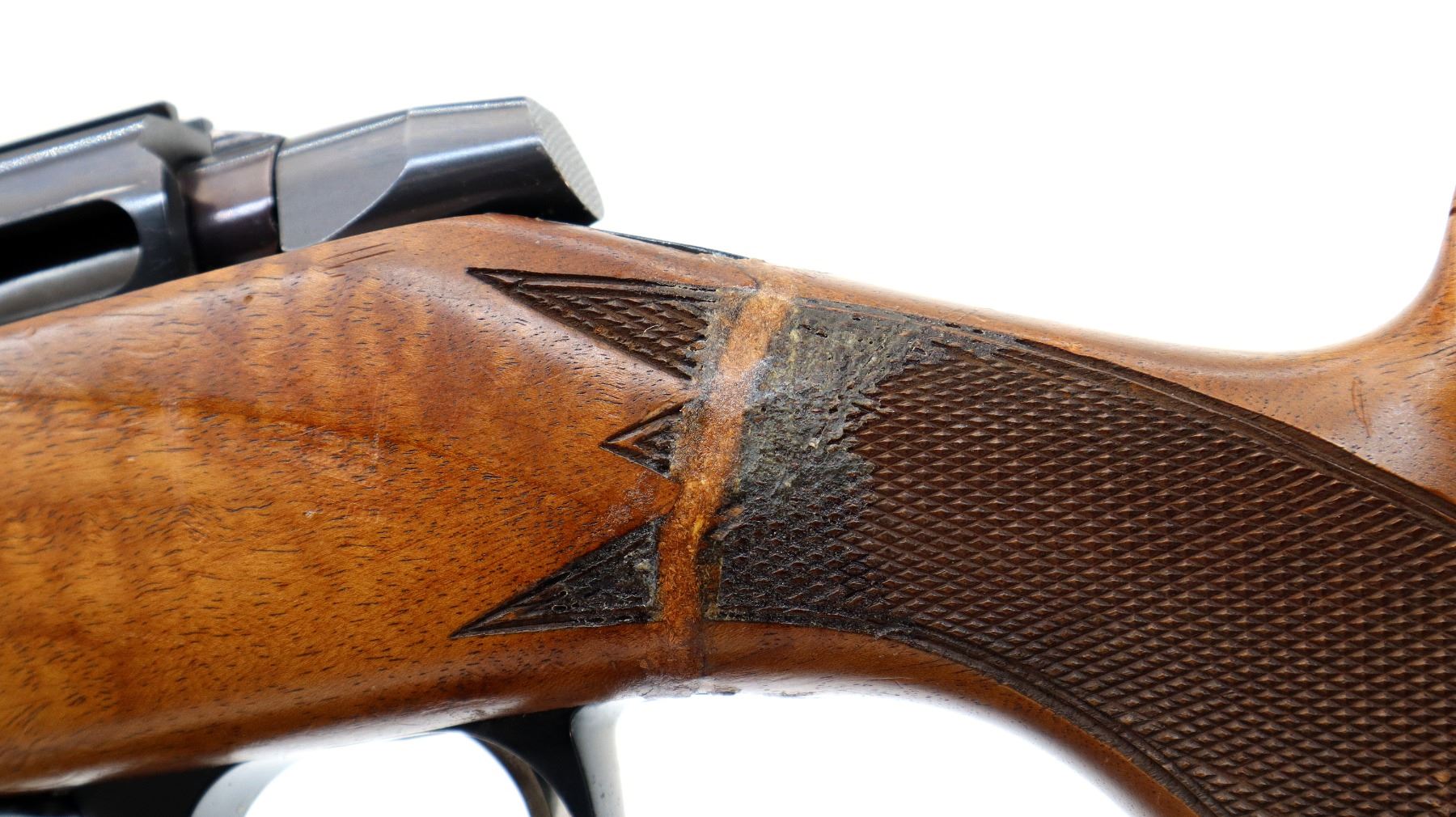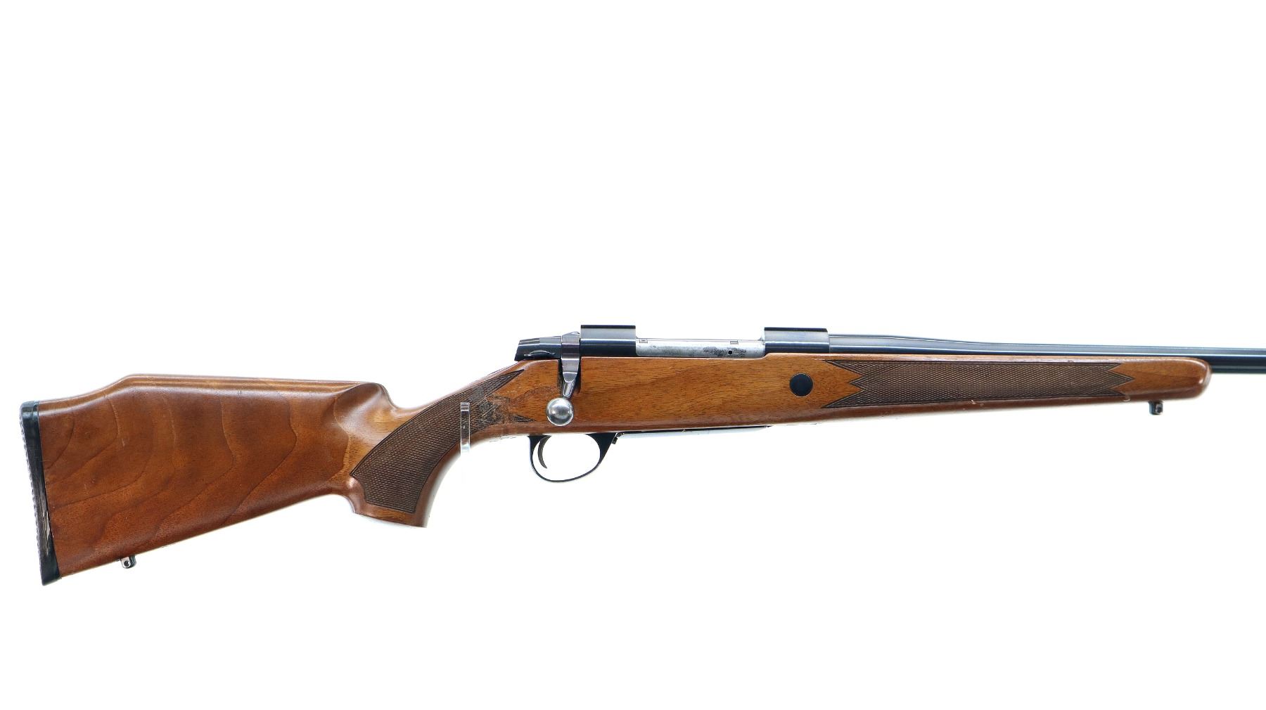Main Description: Missing front and rear sights threaded holes present, blued finish, receiver has integral scope bases, smooth bolt knob. Missing bolt stop assembly. One piece wood stock, checkered forearm and pistol grip, stock has been broken through wrist and repaired, cheek rest, black rubber recoil pad, hinged floor plate, swivel studs.
