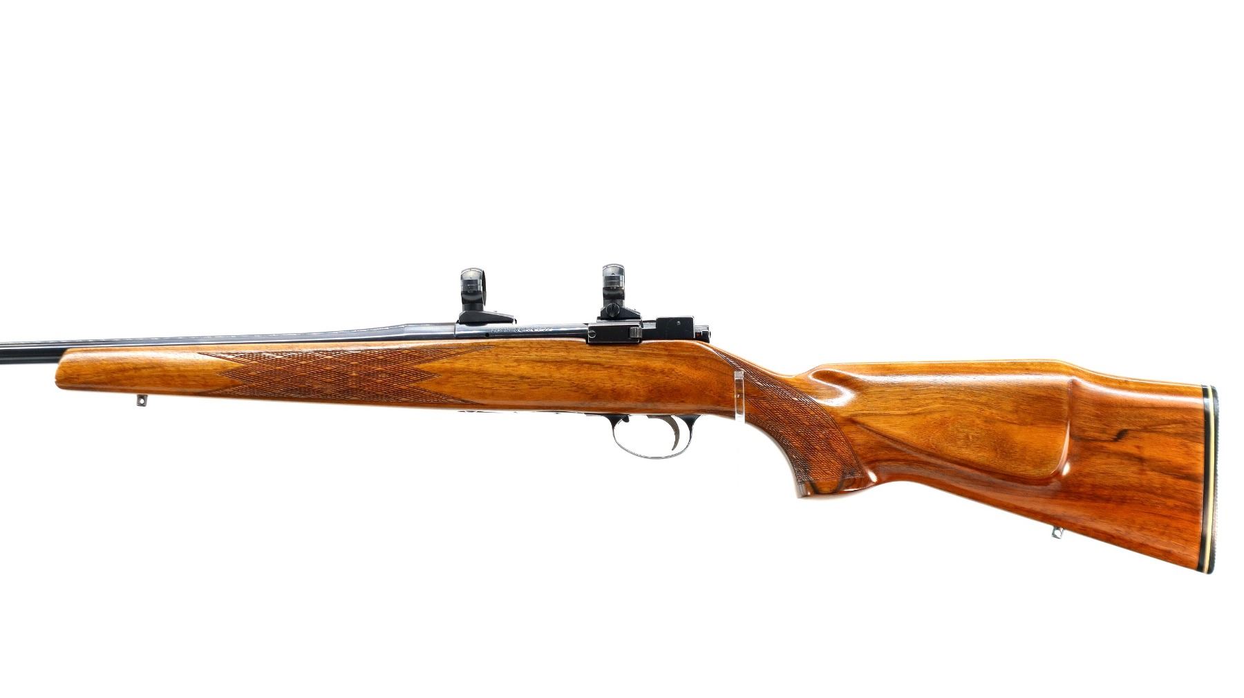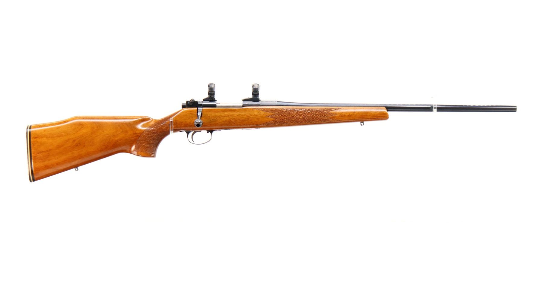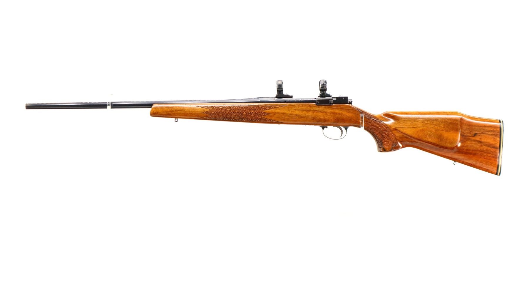 Main Description: No sights, blued finish, tapered round barrel which is unmarked, receiver has integral scope bases with 1" turn in rings installed, checkered bolt knob. One piece Satin finish wood stock, checkered forearm and pistol grip, cheek rest, grooved black rubber recoil pad, 14.25" LOP, steel trigger guard, swivel studs.