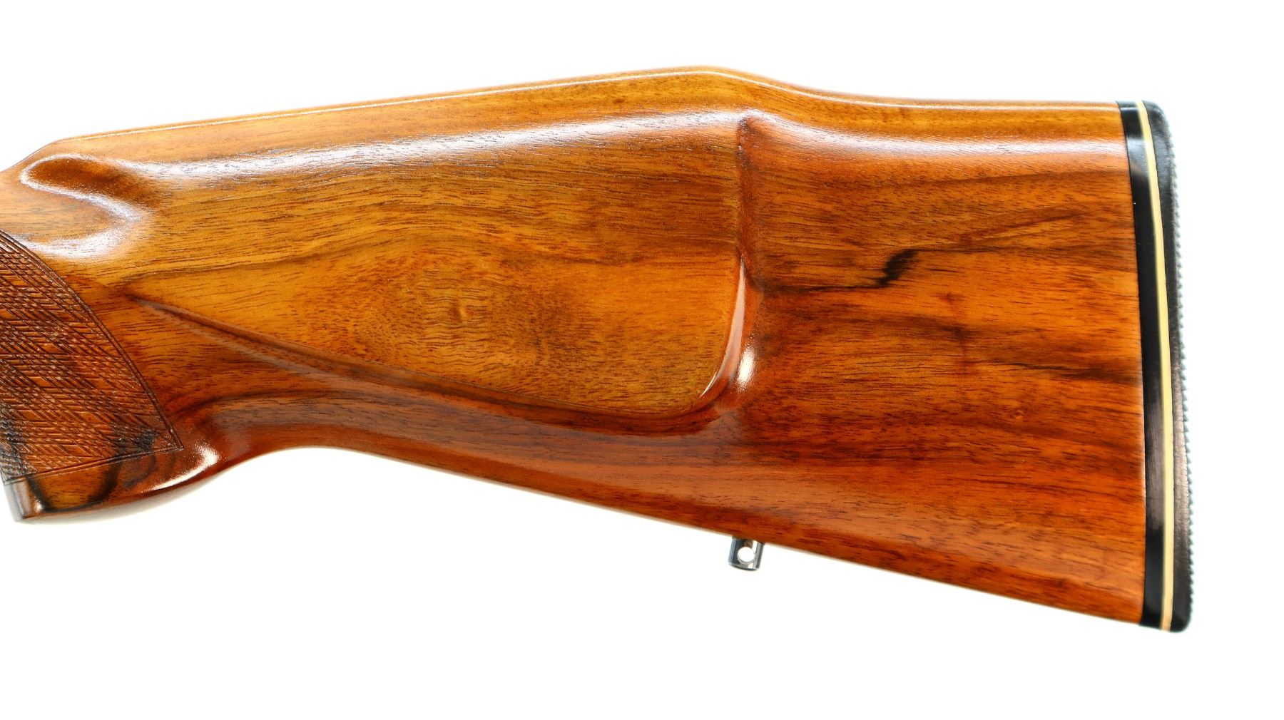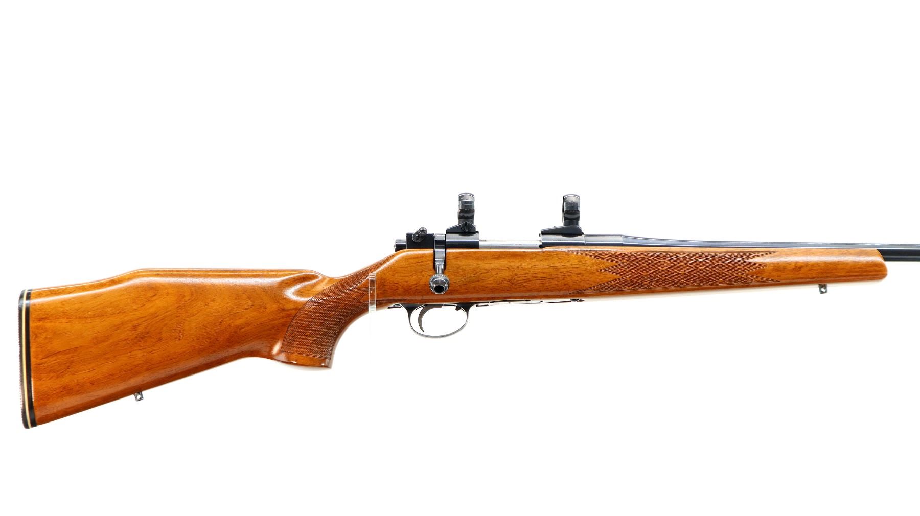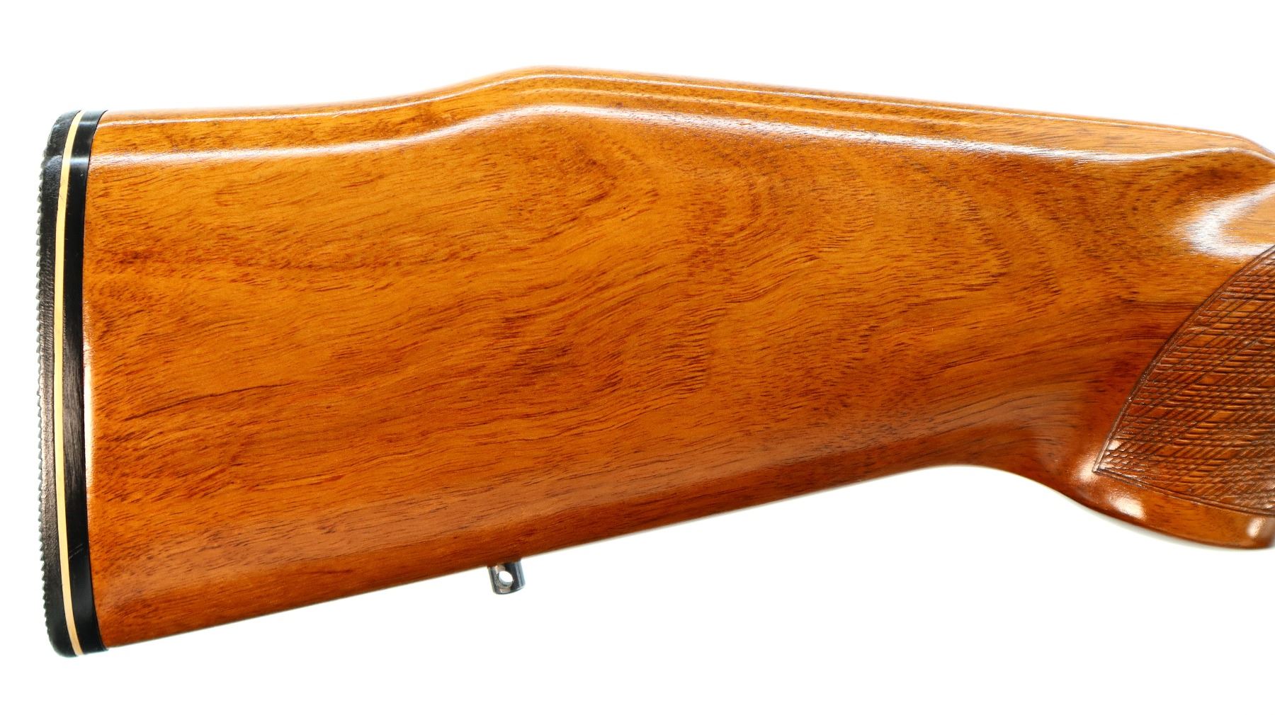 Main Description: No sights, blued finish, tapered round barrel which is unmarked, receiver has integral scope bases with 1" turn in rings installed, checkered bolt knob. One piece Satin finish wood stock, checkered forearm and pistol grip, cheek rest, grooved black rubber recoil pad, 14.25" LOP, steel trigger guard, swivel studs.
