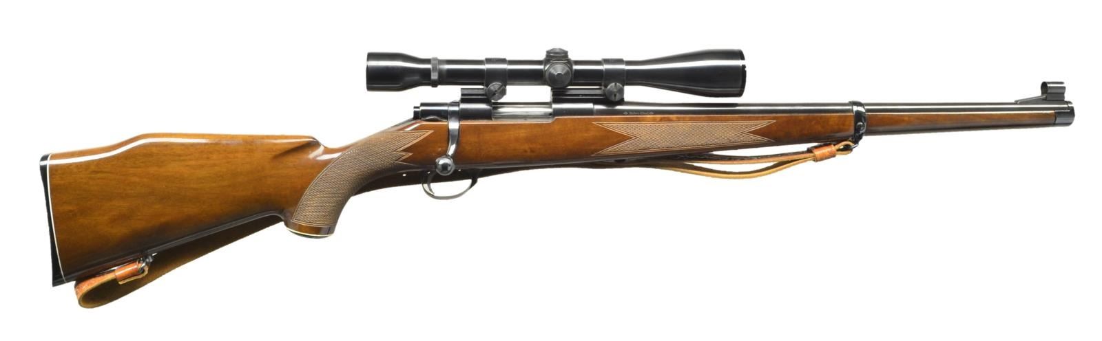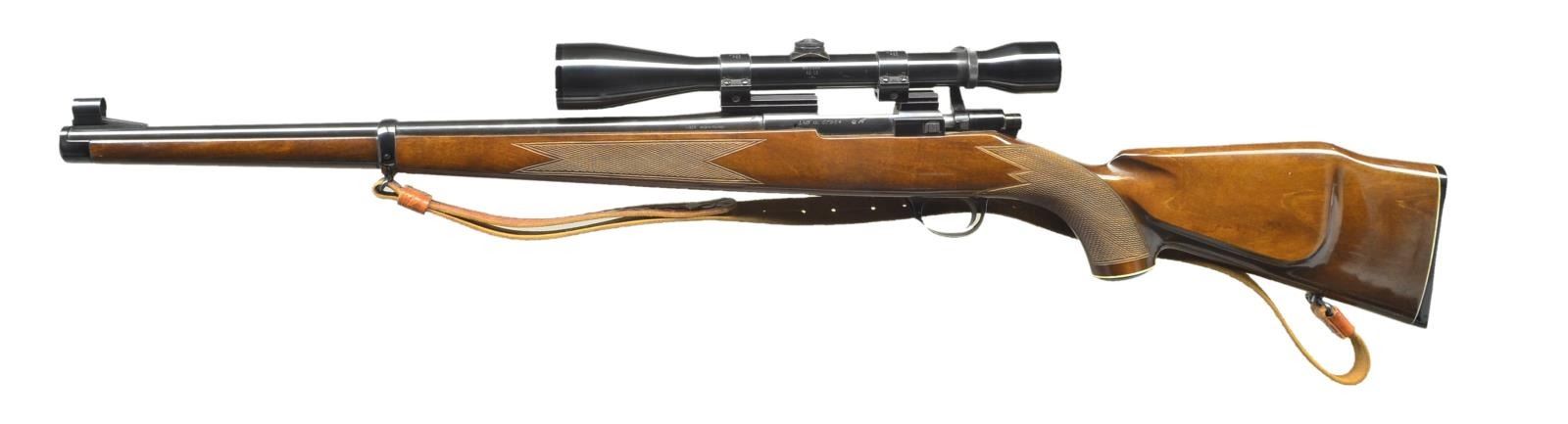 Cal. 222 Rem. S# 67964. Bbl. 20" w/ hooded front sight & no provision for rear; normally has receiver sight. Mfg. 1964 using L461 short action & checkered mannlicher stock having bbl. band plus nose cap. White line spaced black plastic grip cap & grooved logo buttplate. Weaver mount set holding Weaver K6-C3 blued steel scope w/ duplex reticle. Tooled 1" leather sling. CONDITION: all aspects near excellent including bore & scope set. (22-3227/NW). CURIO. $900-1,400.
