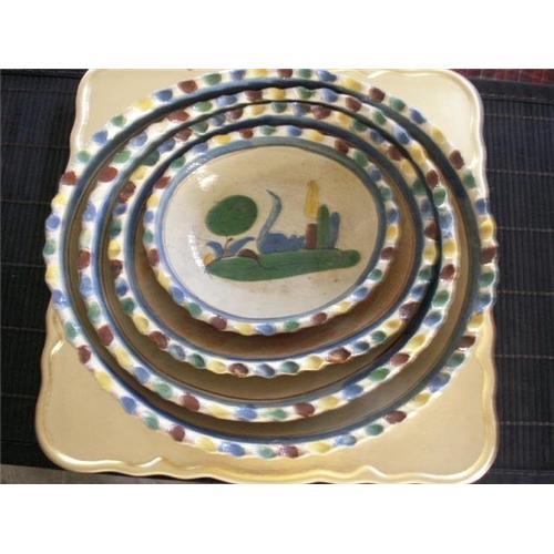 Mexican Terra Cotta Nesting Bowls consisting of 4 perfect handcrafted dishes from Tlaquepaque. Each of the four bowls depict a 4 different graphic designs. The outer edges are finished in a hand done pie crust form and painted with an utterly charming color scheme of blue, yellow, green, and terra-cotta. <p>The clay is wonderfully light and thin, as one often anticipates with Mexican ceramic pieces of such an early circa 1940's. Each plate is painted on a creamy slip background -- Markings are on the bottom show Mexico hand written.<p>Measurements of the bowls, beginning with largest are: 11 1/4" x 10 1/4"; 9 3/4" x 8 3/4"; 8 1/2" x 7 1/4"; and 6 3/4" x 5 3/4".