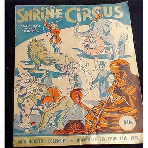 This is a wonderful Shrine Circus Arabia Temple Annual Shrine Circus program from the Sam Houston Coliseum November 7th through 14th 1942. Is the picture of the Clown Emmett Kelly? Colorful front page, and the inside is FULL of advertisements for WWII War bonds, Pepsi Cola, Sears Roebuck and Company, Stetson cowboy hats, Southern Select Whiskey, Bell Cab company , Alamo freight lines, and much more so a great find for advertising. First on the program came THE BAND CONCERT Izzy Cervone Conducting Arabia Temple's concert band 2. THE GRAND ENTRY, 3. HARRIET BEATTY With her sensational TIGER 4. JUGGLING The Henderson Trio, 5. NOBLE CLYDE BEATTY THE KING OF THEM ALL 6. HIGH WIRE The Great Le roy and Co. 7. SHELAR THE CRAZY & WHIRLING ACES 8. AERIAL DISPLAY Sahlen's Duo, 9. DAINTY ZEFTA bareback horse riding star 10. DOG AND PONY JUBILEE 11. NOBLE CLYDE BEATTY'S PERFORMING PACHYDERMS (ELEPHANTS) 12. CLOWNS 13. La TOSCA 14. AERIAL BALLET 15. HOLLYWOOD CHIMPANZEES monkey business 16. Clowns Pete and RePete 17. HIGH WIRE SENSATIONS 18. BAREBACK RIDERS 19. GREATEST OF ALL DAREDEVILS The Great Peters 20. JUGGLING AND BALANCING SUPREME 21. CHRISTY'S LIBERTY HORSES 22. CLOWNS 23. PALLENBERG BEARS 24. RHYTHM IN THE SKY 25. ACROBATS DE LUXE 26. THE GREAT KELLY 27. GRAND FINALE. What a wonderful 17 pages of advertisement, pictures and historical memorabilia and WWII war bonds advertising. This has tear in the bottom shown in the picture and one small 1/4" one on the side. This ...