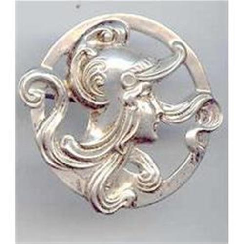 This is a quit enticing Art Deco style Pin. I am told this is a Greek Goddess of Wisdom, Athena. It is 1 1/2 " round. Elegant and enticing as the art Deco era is. Romance is what this pin is about. Just fabulous