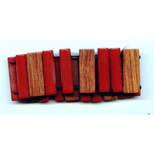 Red and wood Bakelite bracelet. Could go up to 8". Has black stretchy cord holding it together. Could be from the 1930 or 40's Magnificent color.