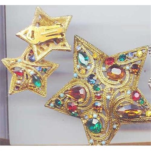 This is Fabulous. Star is 2 3/4" wide . Earrings are over 1" and are clip on so any one can wear them. Look at the colors. you wear this with any thing. Magnificent.