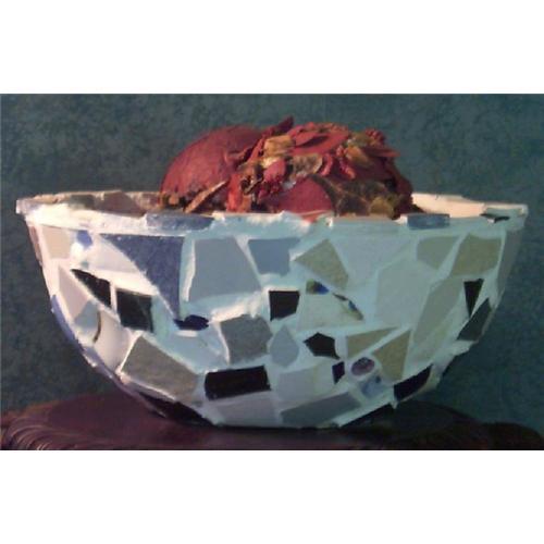</font></strong>This is a one of a kind work of art. This mosaic decorative bowl is an original handmade item by Caroline. The bowl is an ample 12" across the top and is 5 1/4" tall.....just perfect for apples and oranges. It has protective feet to protect your furniture. The bowl is made from broken china, porcelain bits and pieces of beautiful decorative tiles and colored glass. This bowl weighs about 8 3/4 lbs. The colors on this bowl are primarily rose, pinks, and accents of dark blues. On close examination you can find some popular well known china patterns of days gone by blended with colorful glass, porcelain, and broken tile pieces. The tiles are applied with professional adhesives and grouted with top grade grouting and sealer so that the bowl can be used for fruits. The bowl is not dishwasher safe but can be cleaned with wet cloth. Not to be used to serve liquid food. This is truly a beautiful decorator item. It would look so good on your counter top or on your coffee table. The dried floral potpourri botanical balls are not included but can be purchased on this site. <p></font>