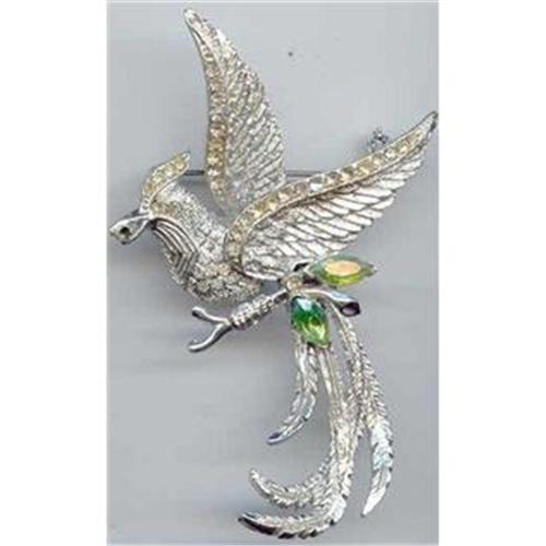 Hope to read the signed bird. it is 3 1/2 by 2 1/2". Quit large.Has rhinestones and aurora borealis green rhinestones. Very brilliant. Silver tone. Stunning.