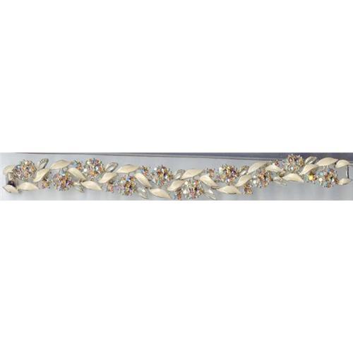 What a fabulous Lisner Bracelet . It has leaves and flowers in white and aurora borealis rhinestones. 7 " long and 5/8" wide.