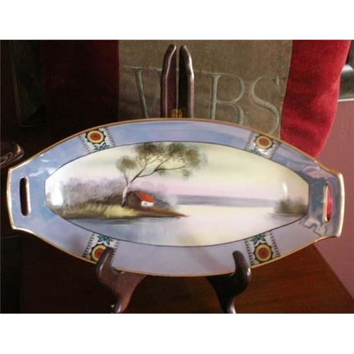 This wonderful Noritake Nippon Porcelain Lustreware porcelain platter or celery dish is vibrant, scenic and depicts the traditional pattern "Tree in the Meadow" pattern and sometimes, Tree in the lake or swan theme. Mint condition with the Early Noritake hall mark (1919-1940) with the wreath-circle "M" for the Morimura factory seal in red.<p>Measurement: 13" Length x 6-1/2" Width x 1-3/4" Tall Stunning Art Deco 1-1/2" Border with floral medallions in a block pattern. Blue Lustreware.