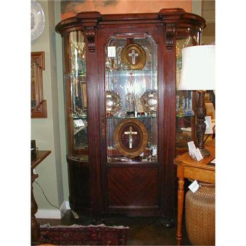 Incredible Spanish mahogany china cabinet with beautiful curved glass sides, glass shelves and a mirrored back. Door opens to reveal a hidden shelf at the bottom of the case. A wonderful way to display your collections and treasures. This item requires professional packaging and insured shipping for long distance and local delivery. Please make request via email for additional photo or question. All fees associated with shipping are the responsibility of the buyer.