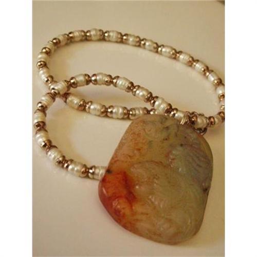 STRIKING ARTISAN DESIGN AND BLEND OF TWO WORLDS:<p>Handcrafted sterling silver and cultured pearl necklace designed in alternating pattern with matching and Earrings accented with a large reddish brown to white shade of Jadeite. Relief carved dragon pendant has translucent qualities when held up to a light. The multi-colored jadeite makes it difficult to photograph the dimension and character of the swirling dragon on the face of the Jadeite gemstone.<p>Measurement: Jadeite: 2" x 1-1/2" Cultured Pearl Necklace: 14" Dangle Pierce Earrings