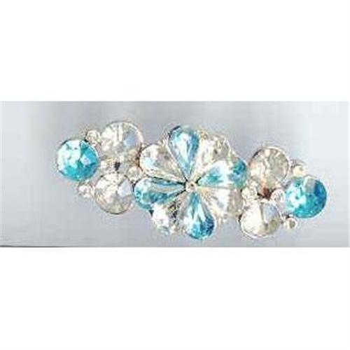 aquamarine color and Clear Rhinestones. About 1 1/2" wide and 1/2" wide. Brilliant. And Glitzy.