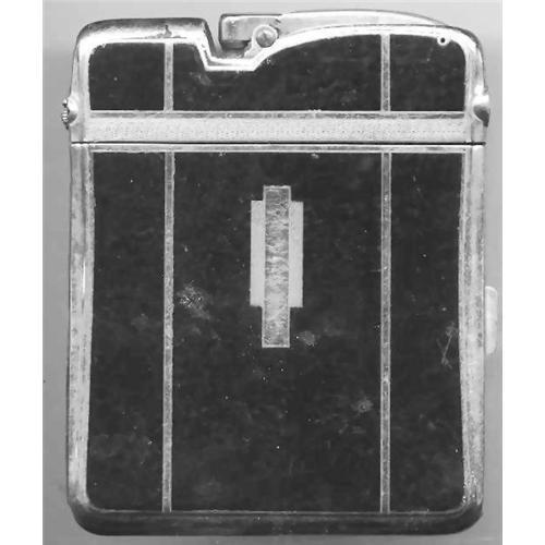 Black enameled with silver tone trim.tiny scratches on the case but did not break the enamel.Looks more like chrome some wear to the leaver for the lighter. Great vintage piece. 4" by 3 1/2" wide. Has the lighter on top.Great
