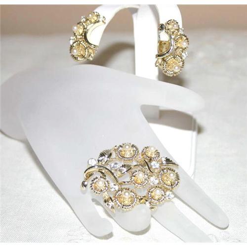 This Gorgeous Vintage 1950s Lisner gold plated, Flower Spray Brooch is absolutely marvelous and very girly!, With each flower holding a small round glass seed bead, highlighted with sparkling Chaton Diamond Cut Rhinestones. The matching Earrings repeat the same pattern as the Brooch. The Brooch measures 2 inches by 1 1/2 inches. Matching Earrings measure 1 1/4 inches by 1/2 inch securing with a clip-back. All pieces are marked Lisner.