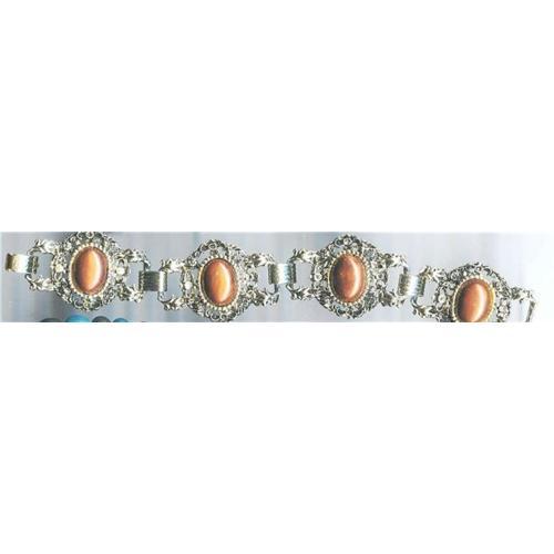 This is a old silver tone bracelet with brown plastic ovals in the center of detailed discs. !' Wide and 8" long. Nice vintage bracelet