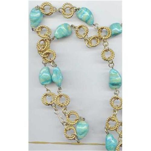 43" necklace or belt if you can. The nuggets are ceramic but look like turquiose . Gold tone chain. Even that is nice. You can also make a large necklace with this piece.