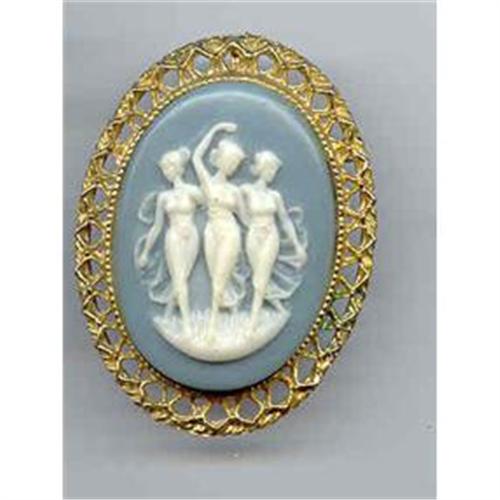 Ornate Cameo pin with the three girls on it with a blue backround.. Not Signed... Gold tone 2" by 1 1/2"... Great condition....
