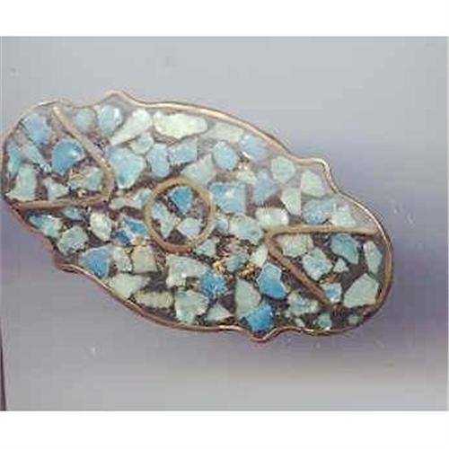 Tiny pieces of turquoise are set in tile in a brass frame. The pin is over 1" wide and 2" long. Workmanship is fabulous