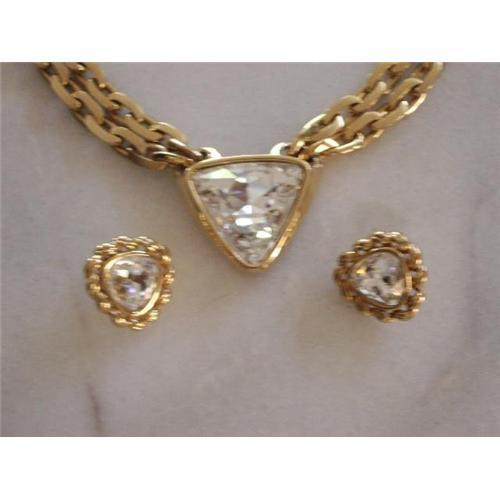 Get Ready for the APPLAUSE!<p>Stepping out on the town? Evening gown or classic pant suit this Swarovski would be a wonderful final touch of elegance for that special event.<p>Description: Gold plated mesh style chain with large center trillon baguette. The lovely earrings are pierced, crystal trillon baguettes surrounded by a gold-tone braiding. setting (SAL). Posts Measurements: 7/8 x 7/8 inches.