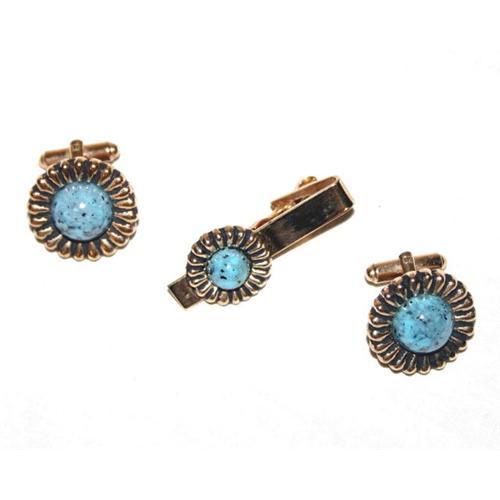 Made in the 1940s-50s this is a great set of Mens Cuff Links with a matching Tie Bar. Gold plated metal with a wonderful antique finish frames the handsome Turquoise Speckled Glass Cabochons. Reverse side of the metal has been incised with a wonderful floral design. The Tie Bar measures 1 ¾ inches long by ¾ inch wide and the Cuff Links measure 1 inch in diameter. Very weighty and well executed and Unsigned.