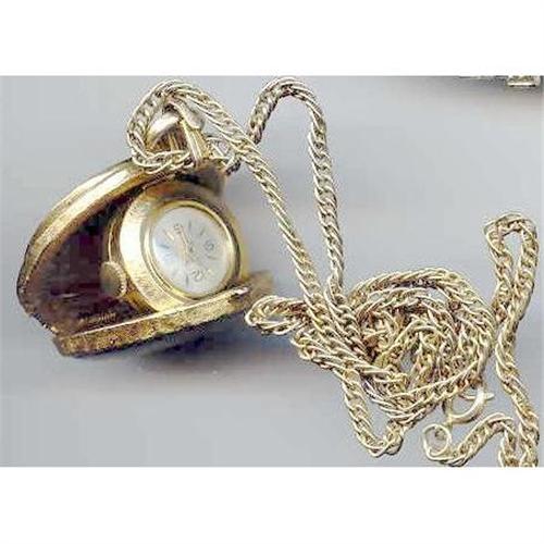 This is a rare Schiraparelli Hanging watch with chain..About 1 1/2" wide and the chain is 24". What a find. Elegant Male and female sitting in the front. Watch Needs cleaning.stops running at points. Wonderful Pendant very colorful. Case is ornate and looks like a hanging pocket watch.