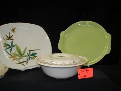 SALEM ASST. LOT INCLUDES (1) 1940, 11 3/4in WOODHUE PLATTER, (1) WOODHUE CREAMER, (1) 11 1/8in TAB HND. RND. PLATTER RANCH STYLE, (1) 13 5/8in OVAL TAB HND. PLATTER CENTURY, (1) 13 5/8in TAB HND. PLATTER SYMPHONY, (1) COVERED VEG. DISH CENTURY 22K TRIM, (1)
