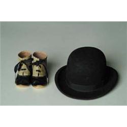Lot 107: SALESMAN SAMPLE HAT AND PAIR OF DOLL SHOES. A wonderful French salesman's sample hat with label of lion with staff, a pair of German man's boots in black and taupe oilcloth. CONDITION: Both are in excellent condition. 1-1761 CL165