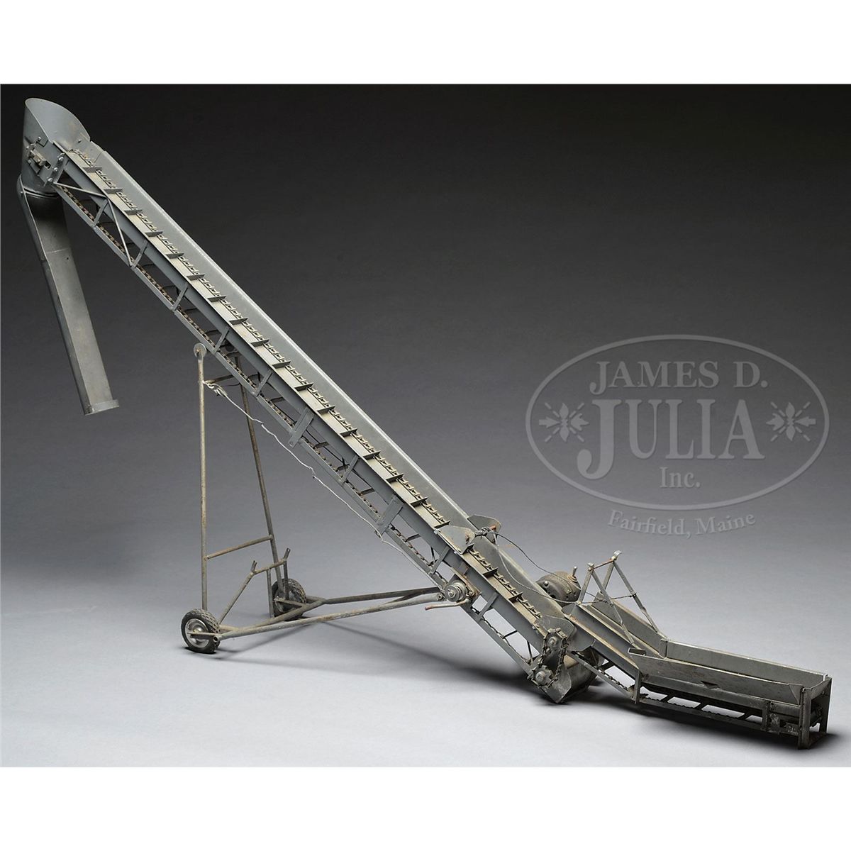 Electric miniature machine consisting of a long conveyor belt leading up to an adjustable incline and adjustable chute mounted to rubber wheeled base for transport. Motor housing is marked "Dayton Electric Mfg Co.". SIZE: 65" l x 35" h. CONDITION: Overall good, electric cord has been spliced, would benefit from general cleaning. Electrics untested. 1-13627