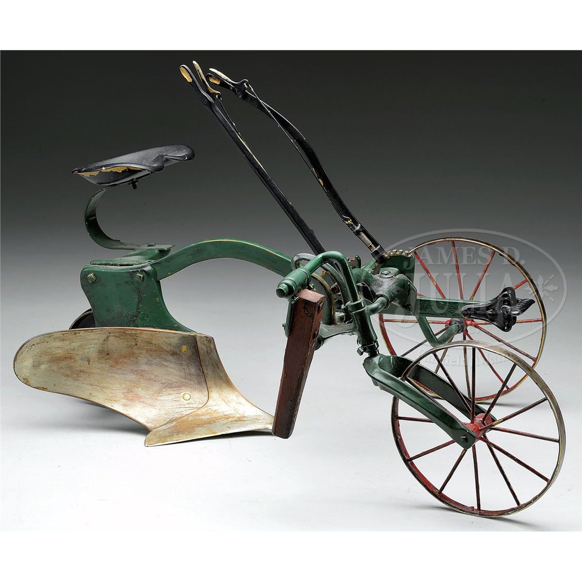 Cast brass ride on plow with formed saddle seat above large formed plow blade and two hand levers that adjust the height of the two spoked wheels for steering purposes. SIZE: 20" l x 15" w. CONDITION: Structurally very good to excellent. Appears to have been repainted at some point in its life. 1-13552