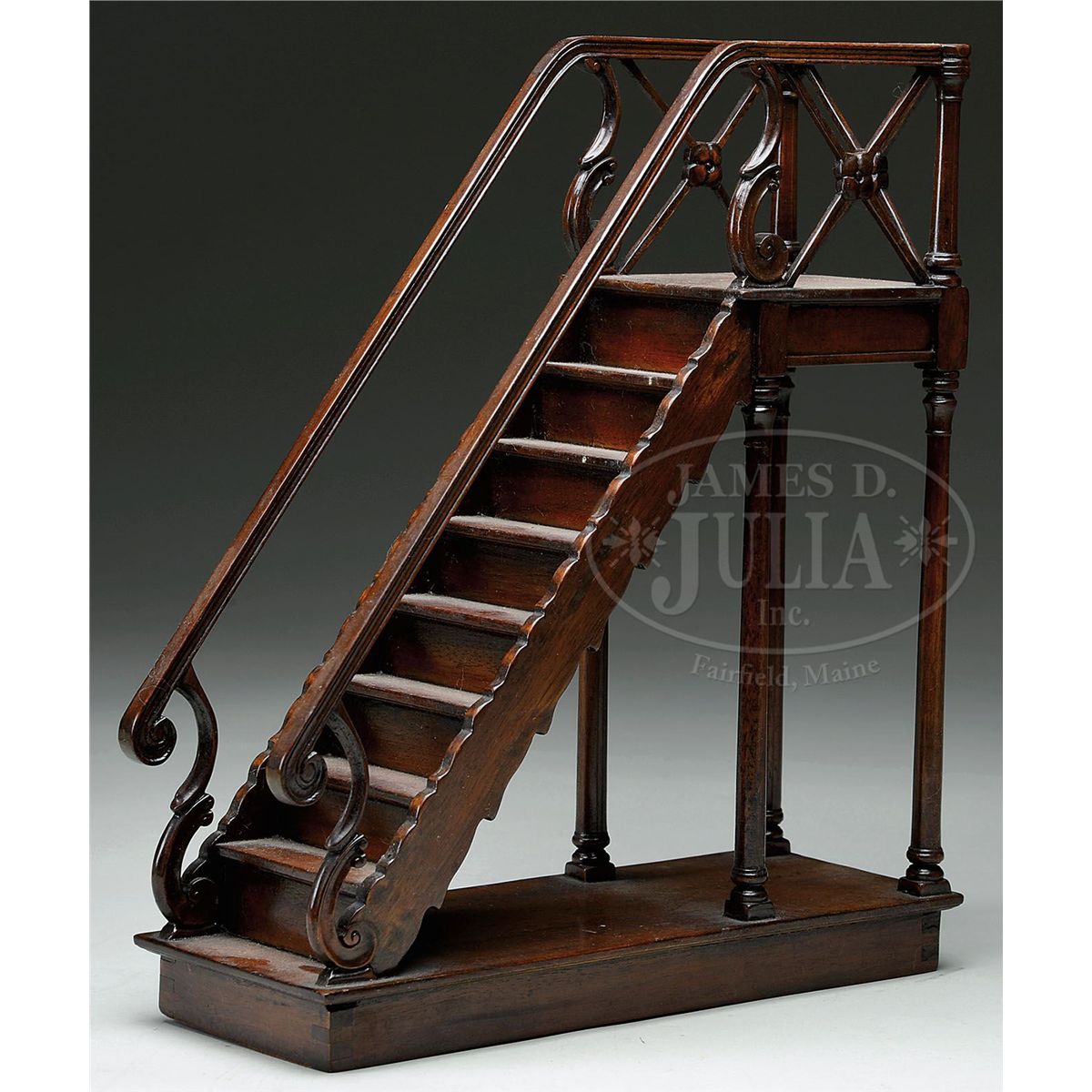 PLEASE NOTE (11/21/13): This may not be old. Exquisite nine step staircase with turned support columns, fancy carved banisters, S-curves and floral rosette accents. SIZE: 12-1/2" l x 14" h x 4-1/2" w. CONDITION: Near excellent. 1-13549