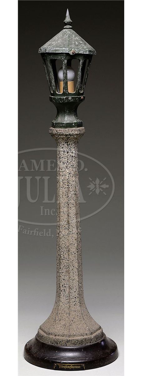 Electric lantern with aluminum housing on a concrete post mounted to wooden base with a Westinghouse plaque on bottom. SIZE: 29" t. CONDITION: Very good plus with some darkening to wood and chips to aluminum housing. Electrics untested. 1-13564