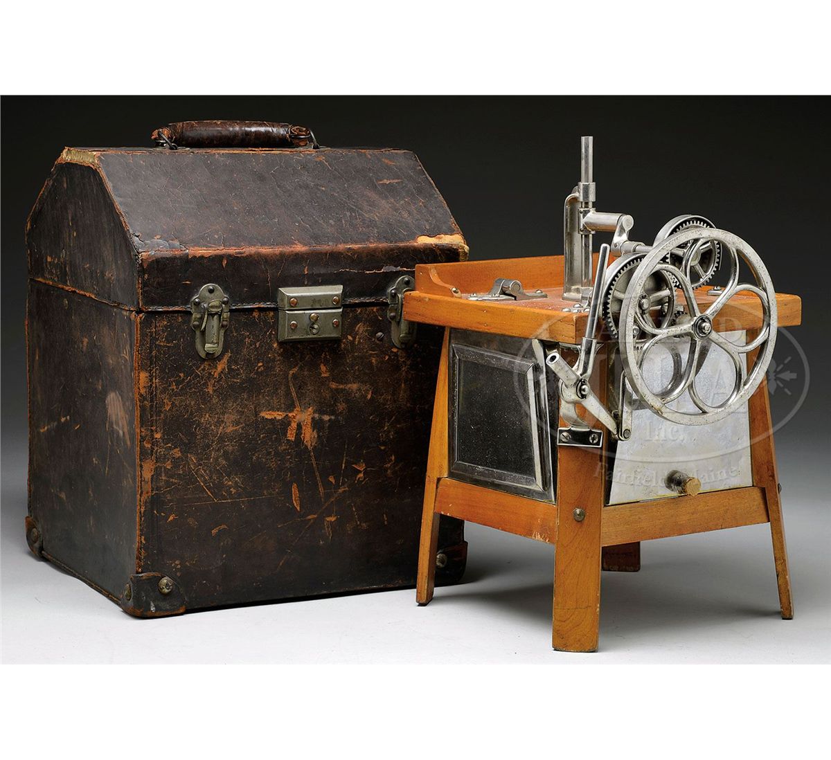 Exceptional early washing machine consisting of a large cubicle nickel plated tub set into a pine frame and topped with lovely nickel plated hardware. Its locking hinged top lifts to reveal an inverted nickel plated cone agitator. The machine is activated by a hand lever that works an elaborate treadle type mechanism with offset wheel that raises and lowers the agitator while rotating it a quarter turn, which can be seen through the two glass viewing windows on the front and back of machine. Washer is accompanied by its original leather felt lined carrying case. SIZE: 10" w x 10-1/4" d x 15" h. CONDITION: Near excellent with a few minor chips. Has smooth operation of gears and components. Case is generally very good overall with alligatoring and some loss to leather. 1-13646