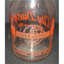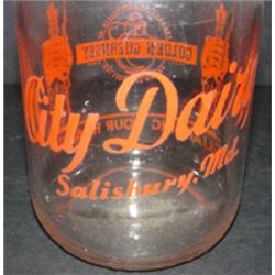 CITY DAIRY SALISBURY, MARYLAND MILK BOTTLE. 1 quart. Marked on front "City Dairy-Salisbury, Md." and marked on back "Golden Guernsey-Guarding your health" with two soldiers.