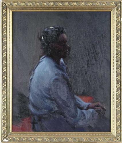 SALLY A. TATE (American, 1908-) GIRL IN BLUE. Oil on canvas portrait of a young black woman in blue dress seated in a red chair. Written on back of canvas "Week of Mar 3, 1952 S. A. Tate No. 24". Unsigned front. Housed in a its original gilt decorated wood frame. SIZE: 22" x 18". CONDITION: Very good. 9-27771