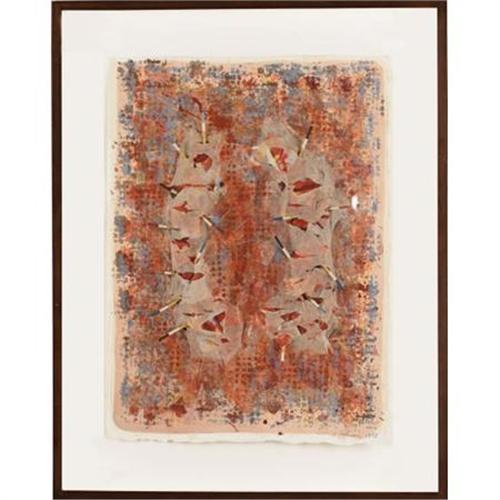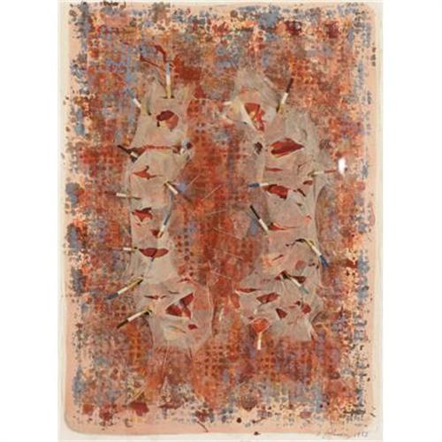 <B>SALLY JOHNSON</B></I><BR><I>Untitled Abstract, </B></I>1985<BR>Mixed media (paper pieces, rice paper, wooden dowels, etc.)<BR>28 x 20 inches (71.1 x 50.8 cm)<BR>Signed lower right<BR> <BR><BR><b>Shipping:</b> Requires 3rd Party Shipping (<a target="_blank" href="http://www.heritageauctions.com/common/shipping.php">view shipping information</a>)