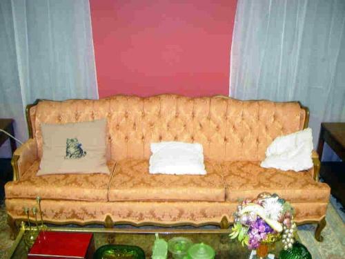 SALMON COLORED CLAW FOOT COUCH, CHAIR & OTTOMAN