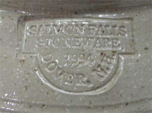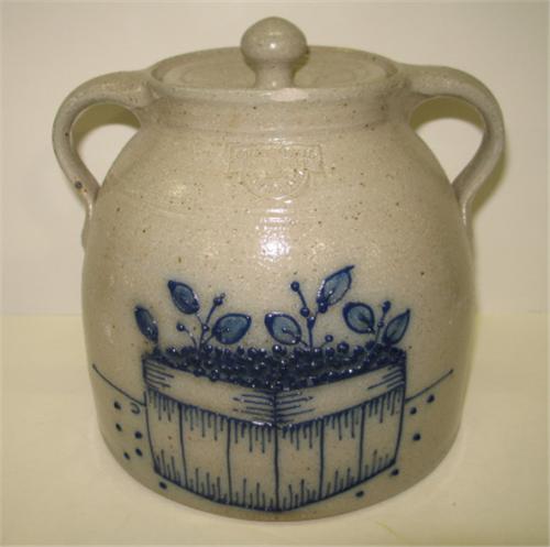 1994 SALMON FALLS STONEWARE BLUE DECORATED DOUBLE-HANDLED CROCK WITH LID. Cobalt blue slip decorated design of berries in basket on front of body. Stamped above design “Salmon Falls Stoneware-1994-Dover, N.H.” One small chip along outer edge of top rim. 7.5” H