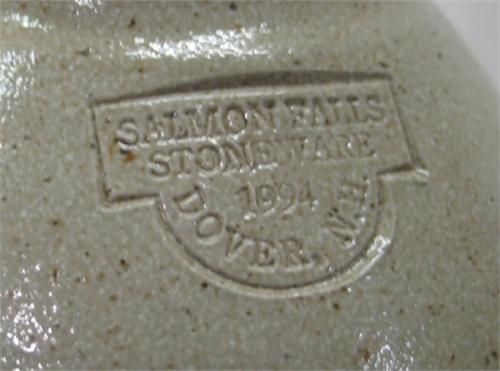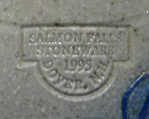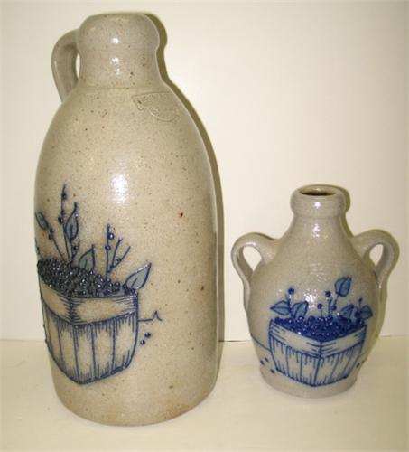 PAIR OF SALMON FALLS STONEWARE BLUE DECORATED JUGS. Consists of one handled jug with cobalt blue slip decorated design of berries in basket. Stamped above design “Salmon Falls Stoneware-1994-Dover, N.H.” 11.5” H. Also consists of one small double-handled jug with cobalt blue slip decorated design of berries in basket on front of body. Stamped above design “Salmon Falls Stoneware-1993-Dover, N.H.” 6.5” H