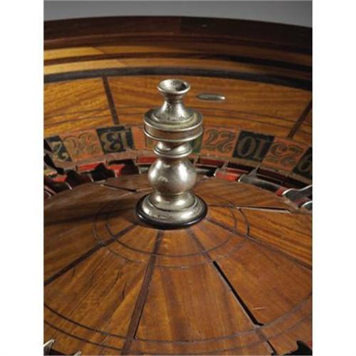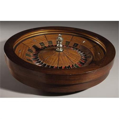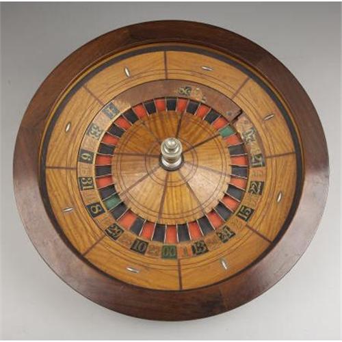 <B>SALOON ROULETTE WHEEL circa 1900</B></I> - half size wheel, convertible with legs for counter top use and lip for table use; very decorative and a nice representative display piece; 21¾ across. <BR><BR><B>Condition:</B></I> Center in poor condition, but all parts intact.<BR><BR><b>Shipping:</b> Other (oversized items, group lo (<a target="_blank" href="http://www.heritageauctions.com/common/shipping.php">view shipping information</a>)
