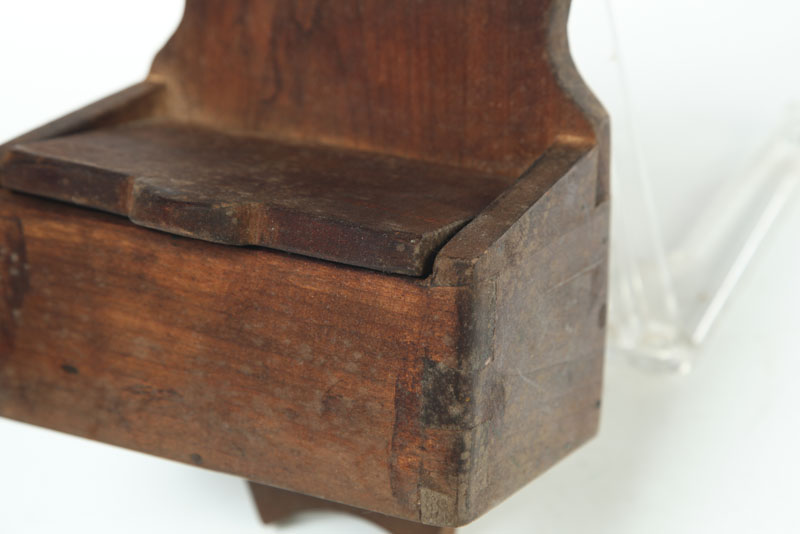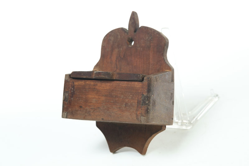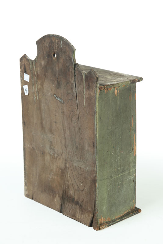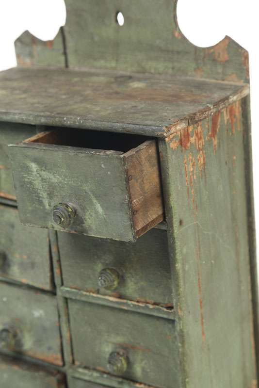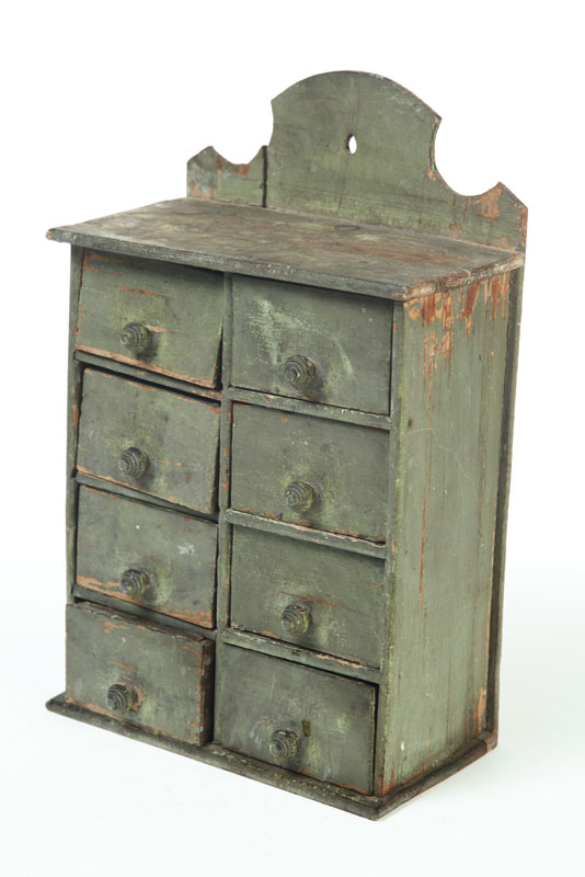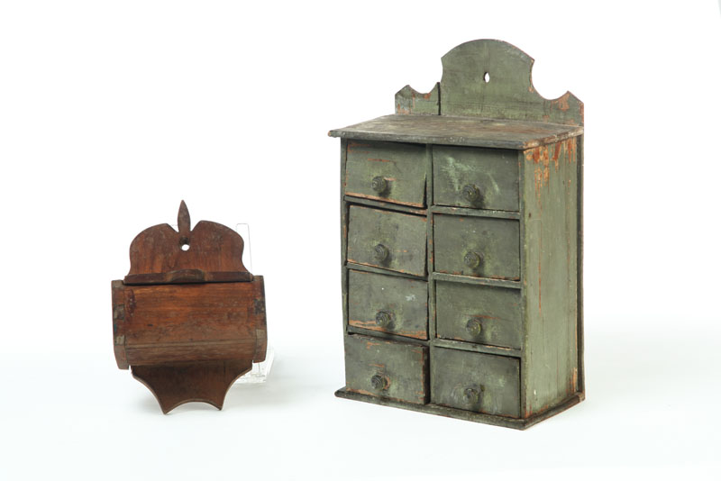 American, 2nd half-19th century. Birch hanging salt box with dovetailed case and shaped crest, 10"h. 9"w., and a pine eight-drawer spice cabinet with wire nailed drawers and worn green paint, 16 1/2"h. 10"w.