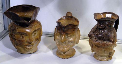 SALT GLAZE GROUPING (3), figural pitchers, condition: chips and hairline cracks, packing and shipping w/in continental USA (excluding insurance) $40