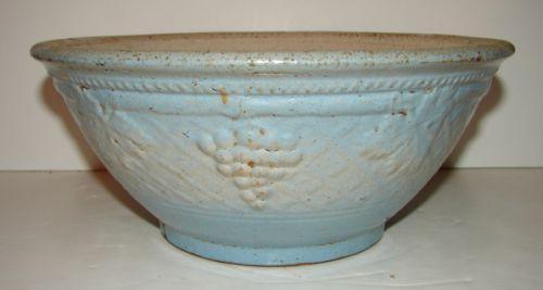 SALT GLAZED BOWL. Blue & white. Relief grape & leaf decorated. Shows some crazing and signs of wear. 4.25” H, 10.25” Dia.