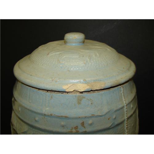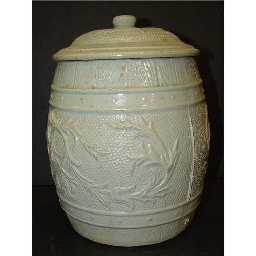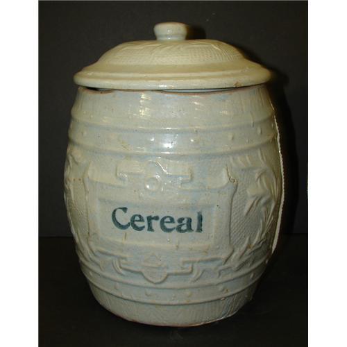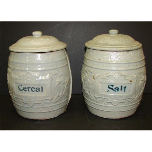 PAIR OF BLUISH GRAY SALT GLAZED CANISTERS WITH LIDS. Relief barrel form with floral and leaf design. Canisters are marked Salt and Cereal. Cereal canister shows tight vertical hairline crack at top of body and lid shows one large chip and one small chip at edge. 8.5” H