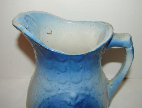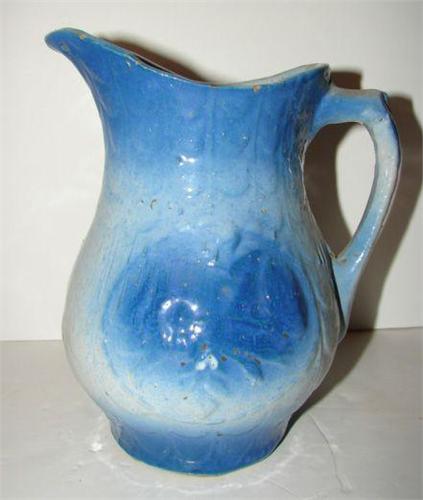 SALT GLAZED PITCHER. Blue & white. Relief floral decoration at front and back of body. Shows some minor chipping around top rim. 7” H