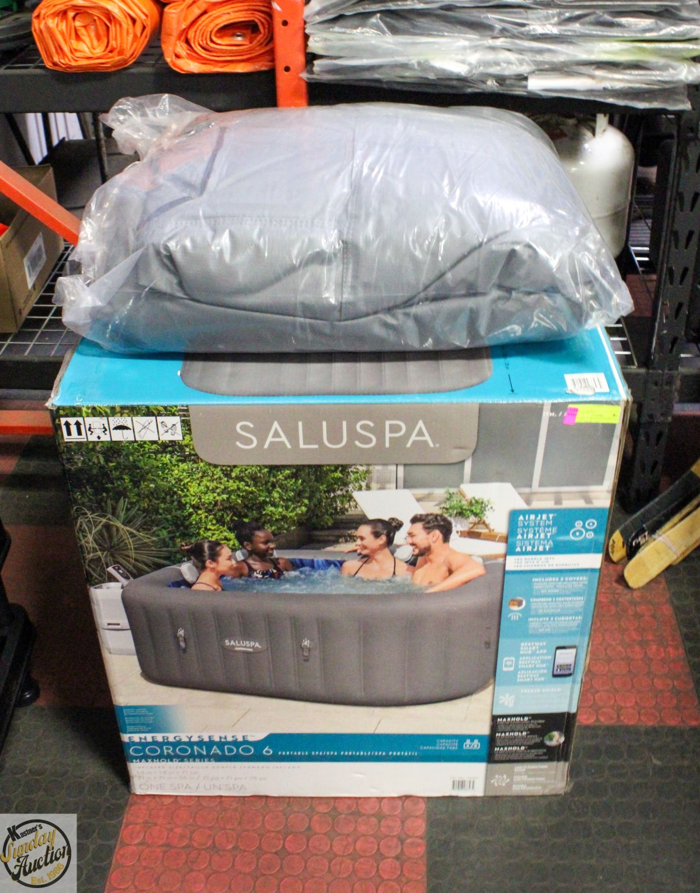 INFLATABLE HOT TUB, 71 X 71 X 28", FITS 6, HEATS UP TO 104F **ALL ITEMS MUST BE REMOVED BY 5PM SATURDAY, NOVEMBER 1ST 2025. ALL REMAINING ITEMS WILL BE SUBJECT TO A $6.00 PER DAY STORAGE CHARGE. ANY ITEMS REMAINING AFTER MONDAY, NOVEMBER 17TH 2025 WILL BE CONSIDERED FORFEITED. NO REFUNDS WILL BE ISSUED FOR FORFEITED ITEMS. TO SCHEDULE A PICK UP APPOINTMENT CLICK HERE